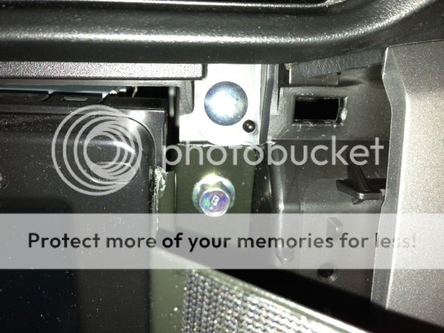 That's the mounting bolt I used. If you look just to the left of the bolt, you'll see two right angle bends very close together to let it lay flat against the head unit. You won't be able to get the dash bezel back on if you don't do this, but it was the hardest part to get right. It looks like the metal is crimped there, but that's just where the paint rubbed off.