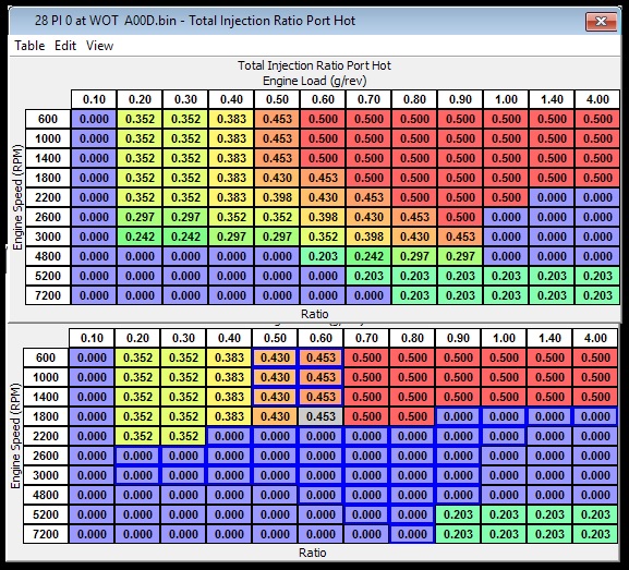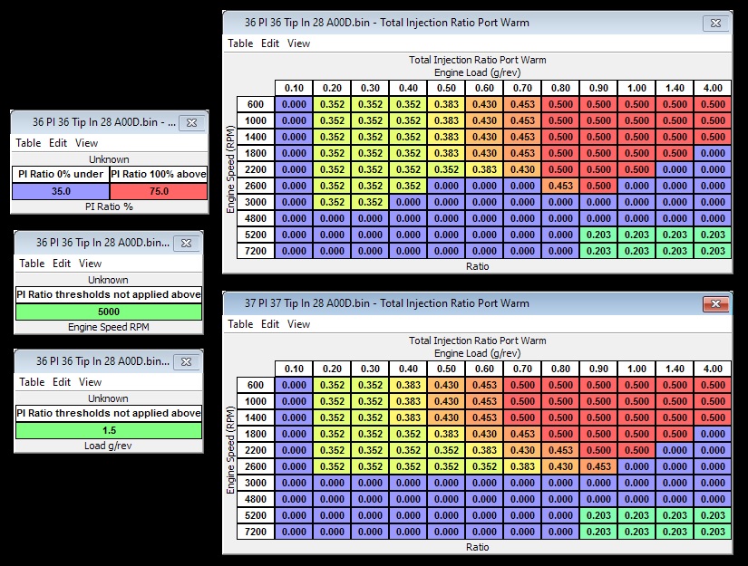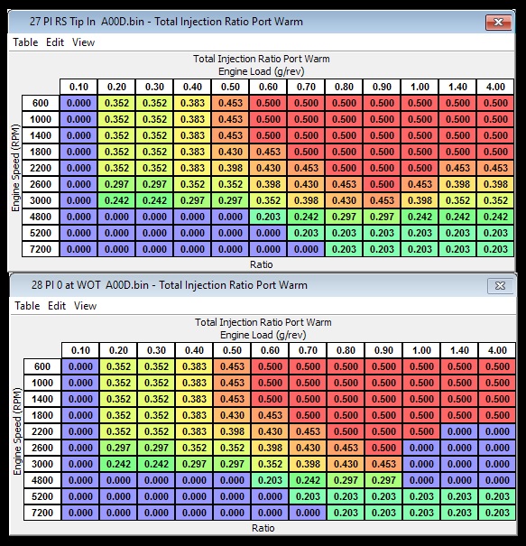 I'll try it and compare these two versions of the PI tables. As you can see, from 1.0 Load on up and 2200 rpms and up till 5200 it is 100% DI. I'll try the two tunes with this as the only change and let you know how it works. Having an AT is great for engine tuning because every change has a much more dramatic effect, but when it isn't running right it sucks the joy right out of driving.