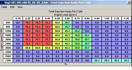 After a couple of tests settled on ratios as below. Made the 3200 line 100% DI as this is arround where the last ltft correction is done (maf arround 3V) and after that your using DI exclusively anyway