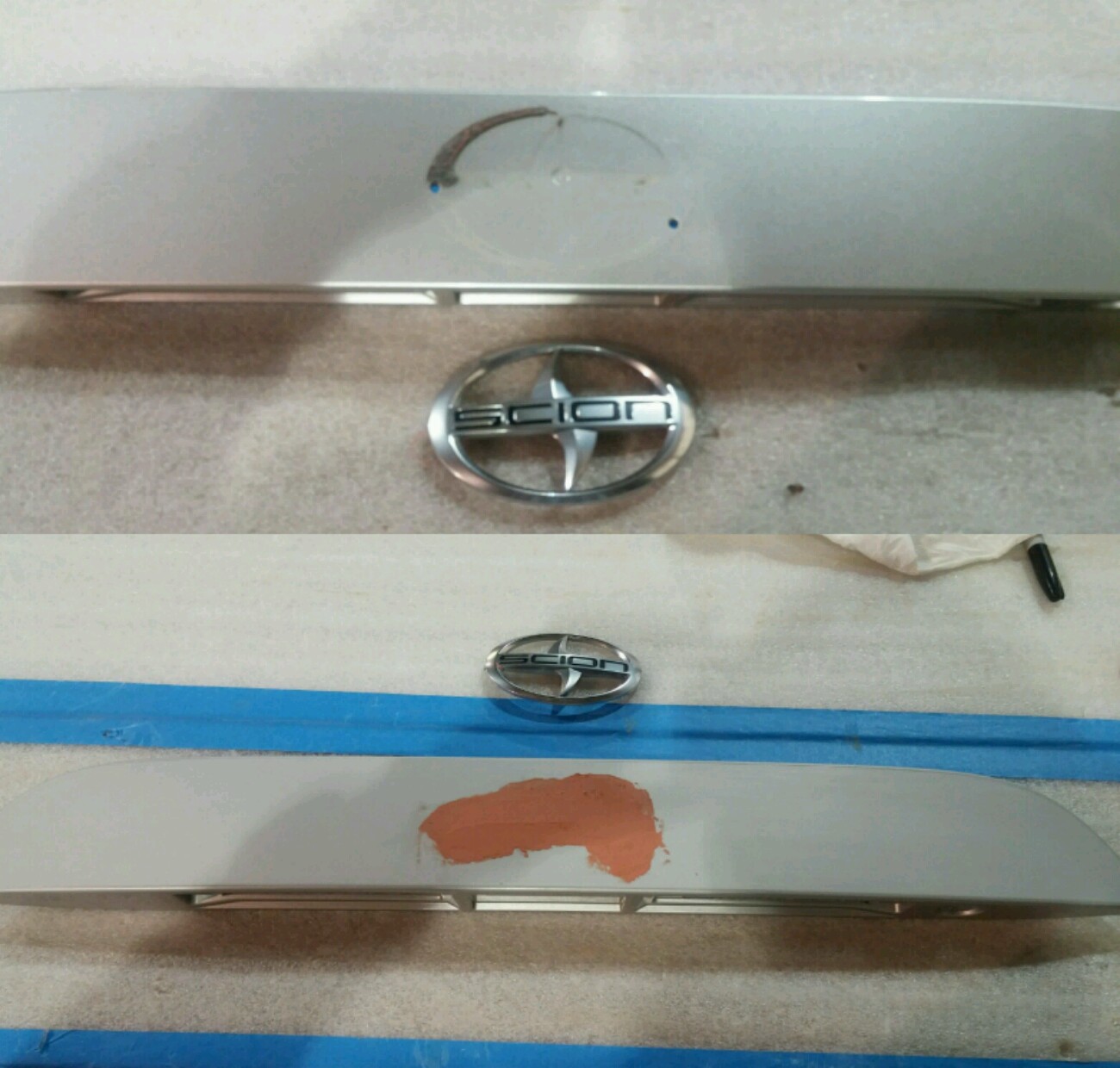 A couple screws hole the piece on , just unscrew. Take some fishing line and slide it behind the scion emblem to cut the adhesive. Then it will pop off . Sand the piece lightly with some 240 grit , mix some bond and fill in the holes. Once dry , prime it with auto primer ( light coats ) 7 or 8 should do . Mark my words if you put it on heavy the primer will crackle! Onec you have a solid primer piece sand the piece with 1000 grit and wipe it with a auto paint tack cloth. Apply light coats of your cars finish color , then wet sand with 2000 grit then apply a final finish coat . once dry apply clear coat 3 times lightly. BAM ! Sent from my LGLS990 using Tapatalk |