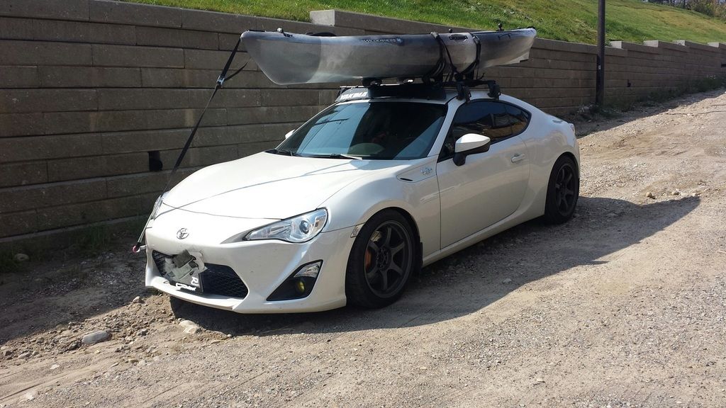 Kayak is a Wilderness Systems Ride 115 Advanced Angler and it weights about 85lbs (38.5kg). I followed the dimensions from @Nubbs on the thread below to mount the Yakima Rack. I am using Yakima Mako Saddles for the kayak. My cross bars are 1 size shorter than the ones shown on the thread below but I like it because it looks very balanced. http://www.ft86club.com/forums/showt...ight=roof+rack I use 3 attachment points for the kayak to prevent movement at 100km/h. These are the factory tow hook attachment points (1 Frt and 2 Rr). I placed some 3M ClearBra material at the four contact patches of the Yakima Q towers to protect the paint. The kayak is mounted solidly and I made sure not to crank down on the tie downs and the Q Tower cam too much to prevent denting the roof. So far, no damage whatsoever to the roof. ![]() ![]() ![]() ![]()