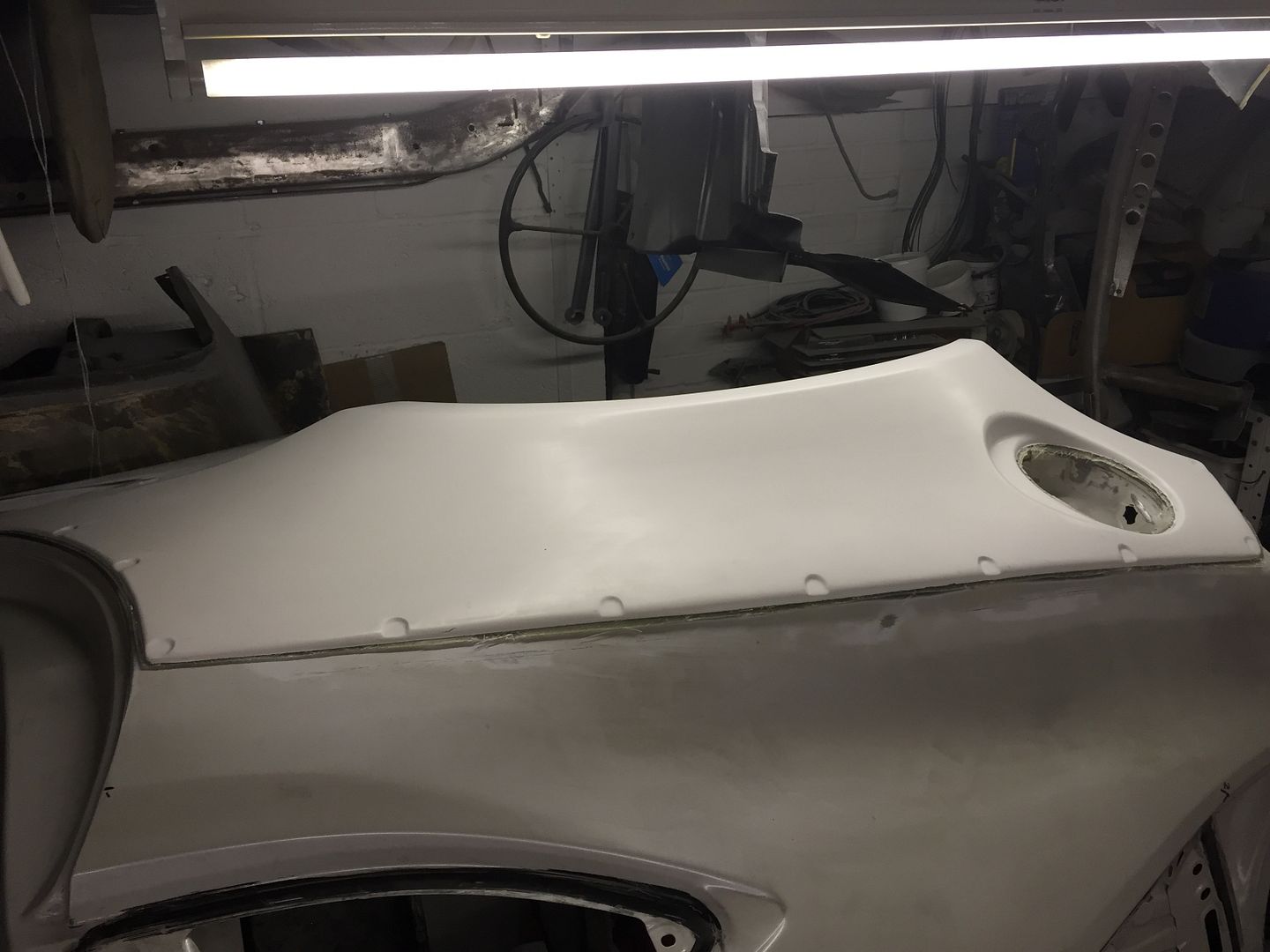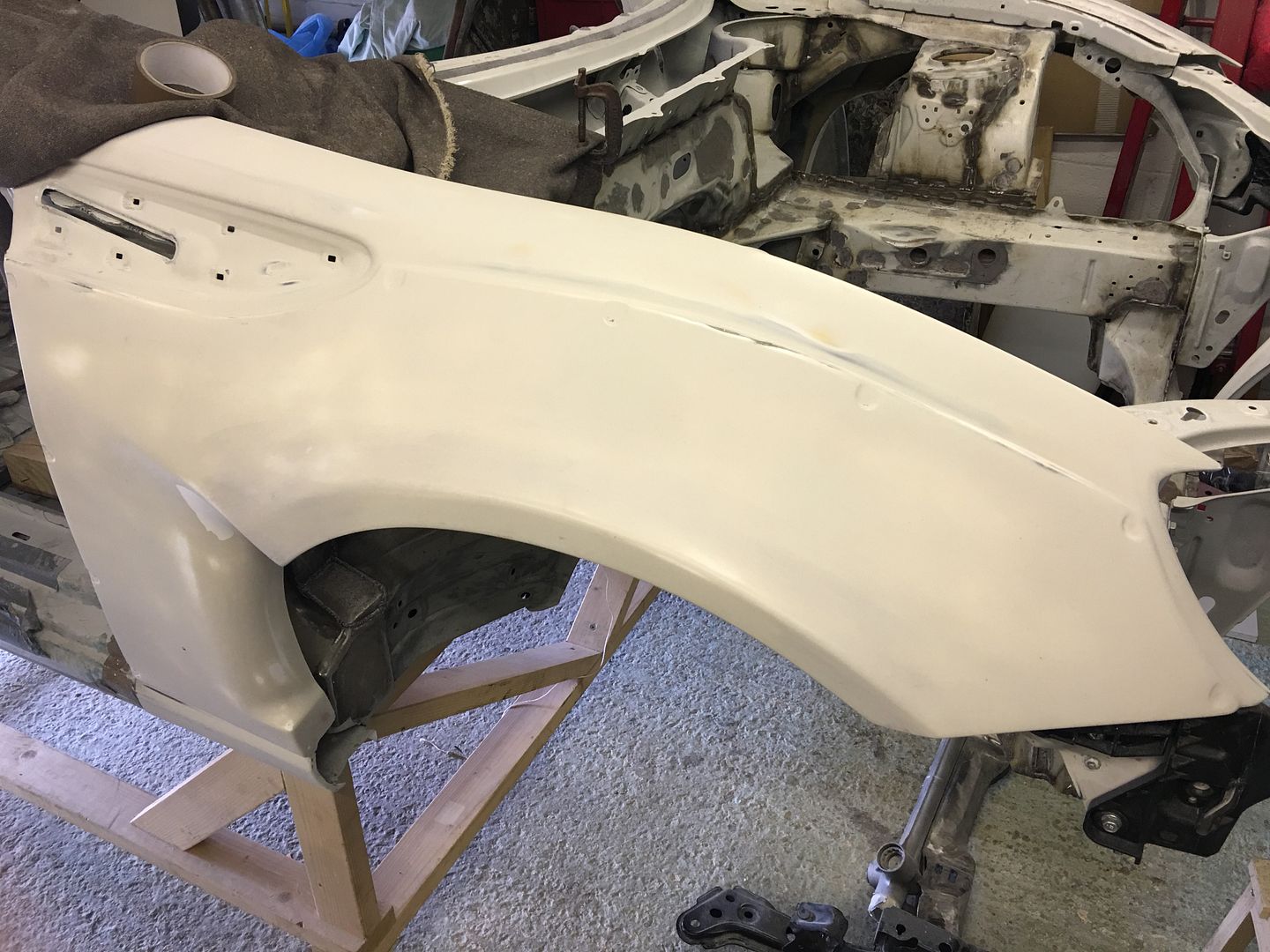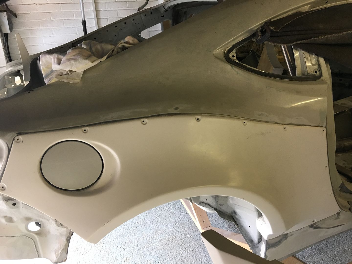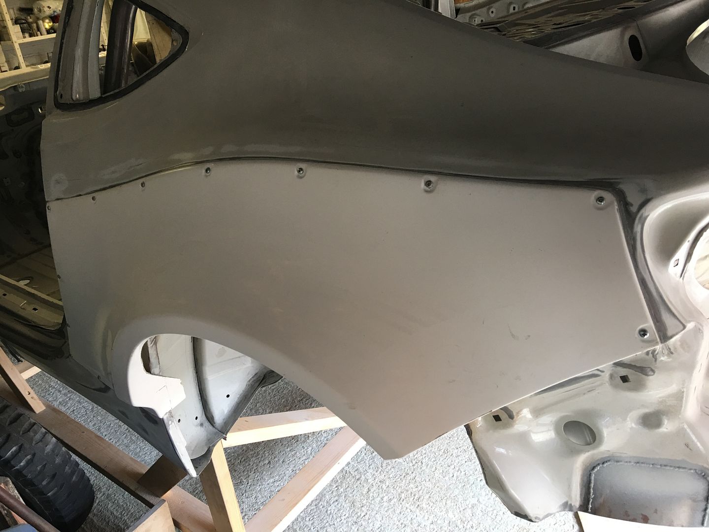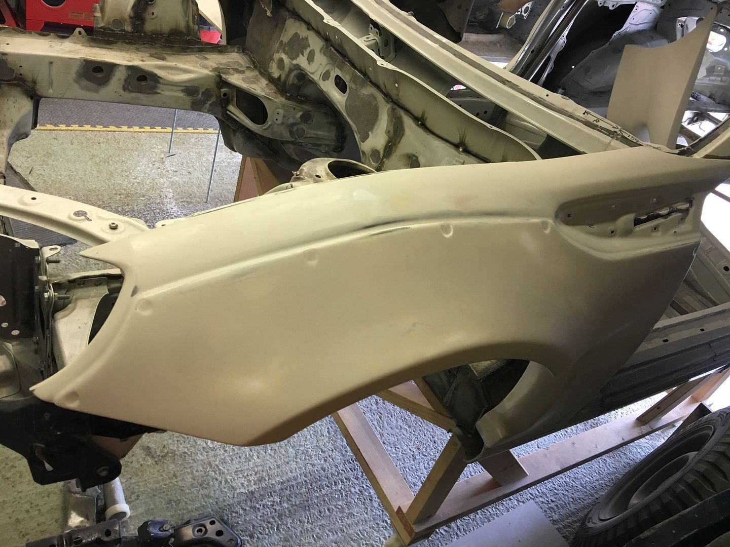 In the next pic we can see the right rear fender just sitting on the car whilst turned on its side. Note the panel is not yet trimmed.