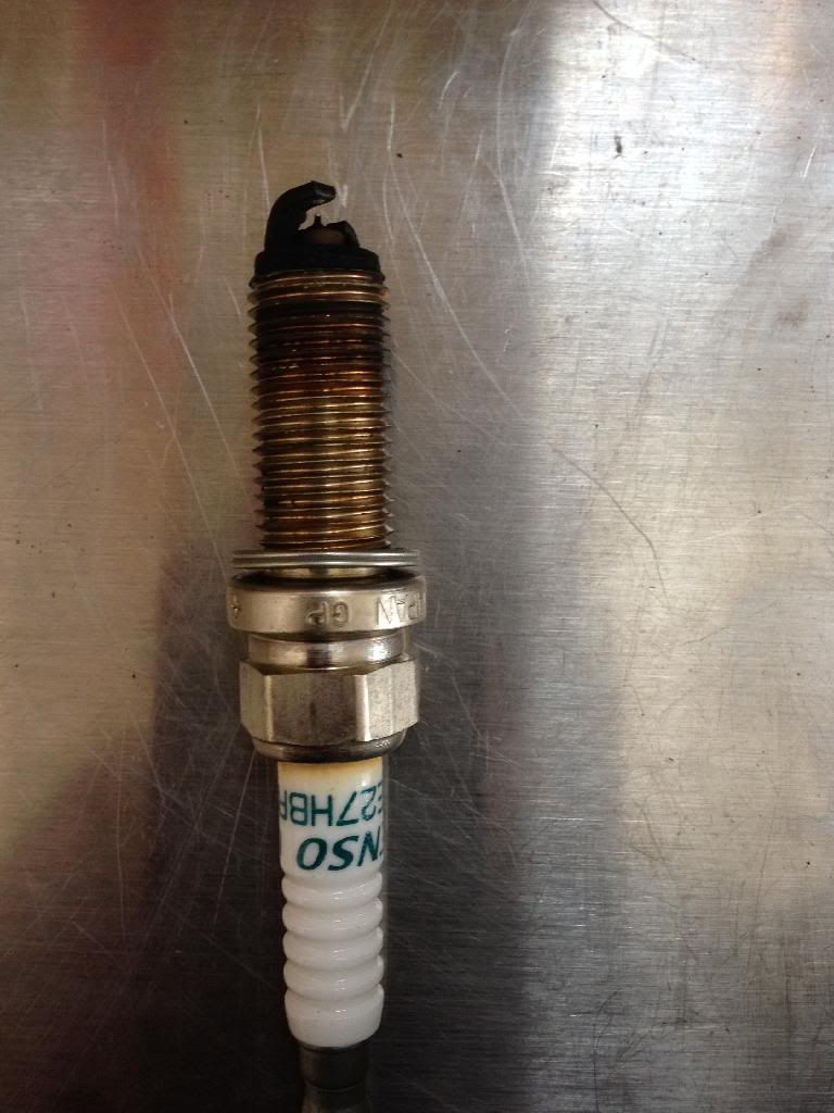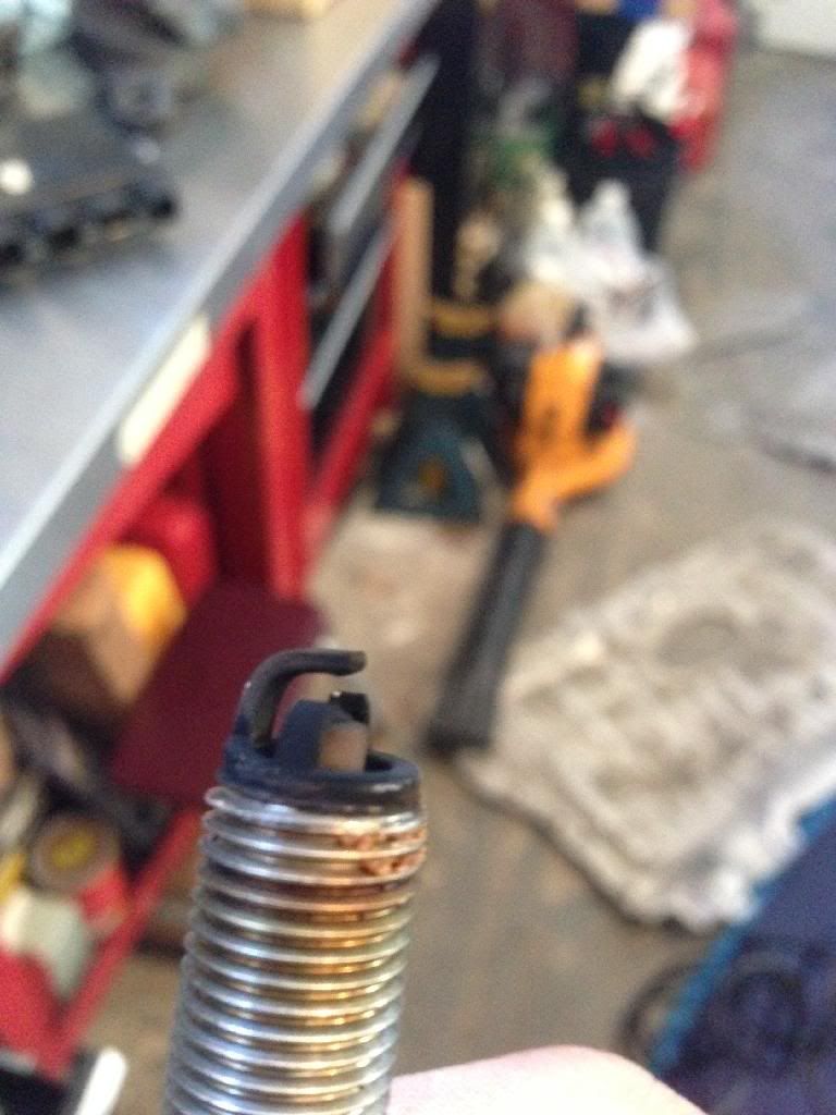 STi Tranny mount went in without a hitch. I forgot how ****TY the stock one is without the whiteline bushing in there. Plugs were easy to get to once the motor was jacked up. You have to remove the ICM on the passenger side (well you don't but it makes it easier), and I took the injector cover off the driver side to get to those packs. The driver side sucks because of the fuel lines. My hands are pretty cut up from all the **** over there but swapping the plugs was pretty simple. Stock plugs: ![]()