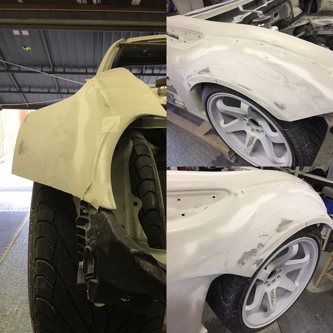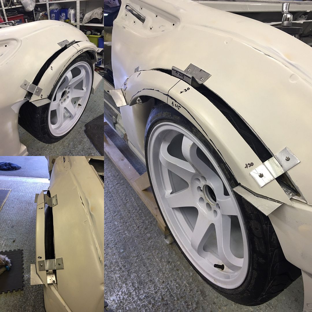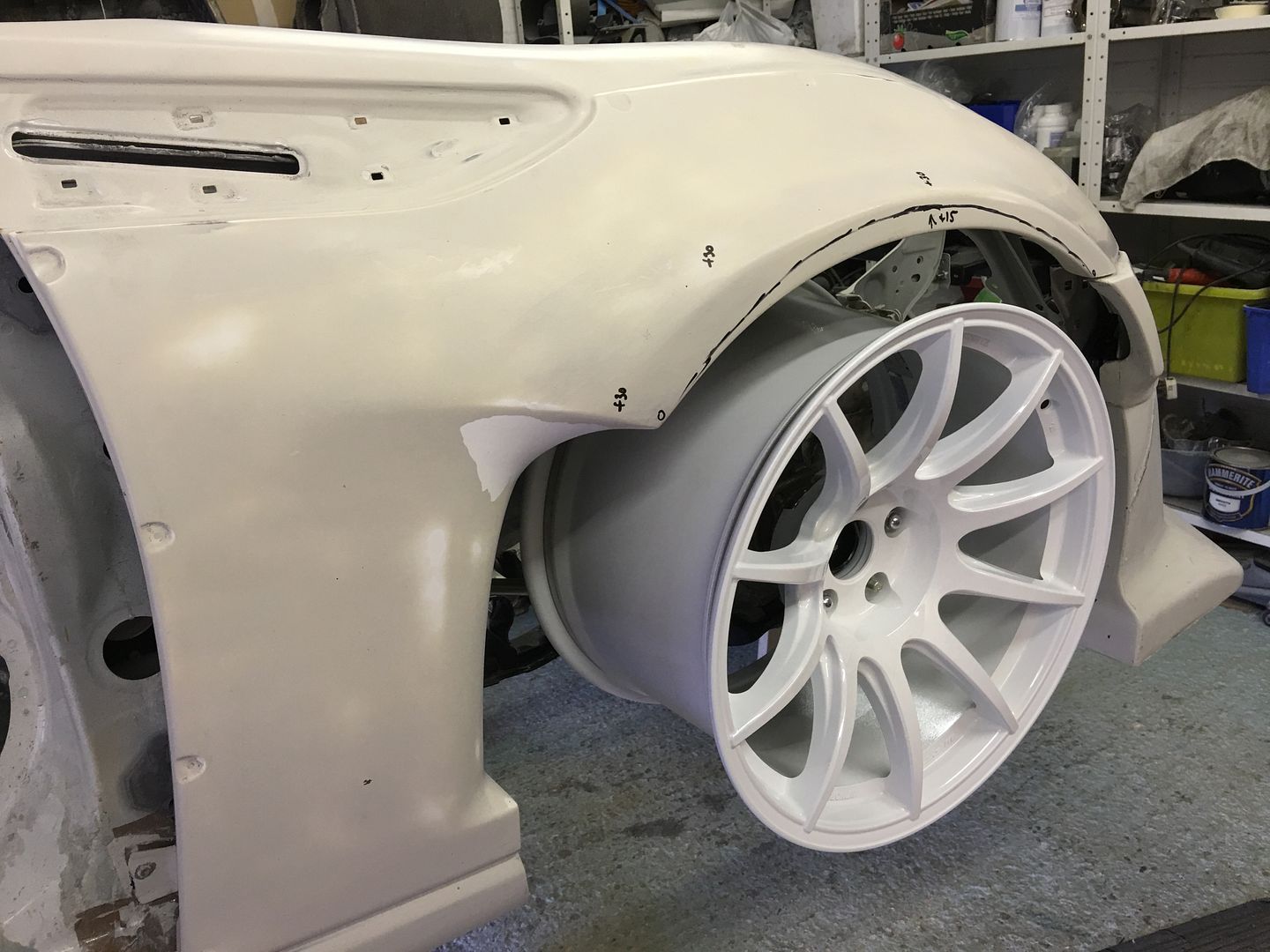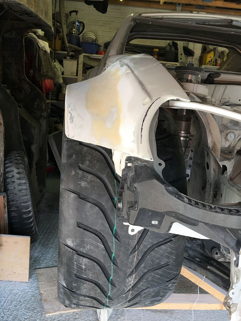 Here we can see the chosen wheels. Work of Japan MCO Racing in 11x18 et 18, kindly loaned to me by Driftworks and Rich Starkey. ![]() It's too wide for the stock RB v1 fender, so I've done this..... ![]() This is the start of a RBv1 fender getting widened by 33mm and raised by 15mm to get those massive tyres in and have the car low!!