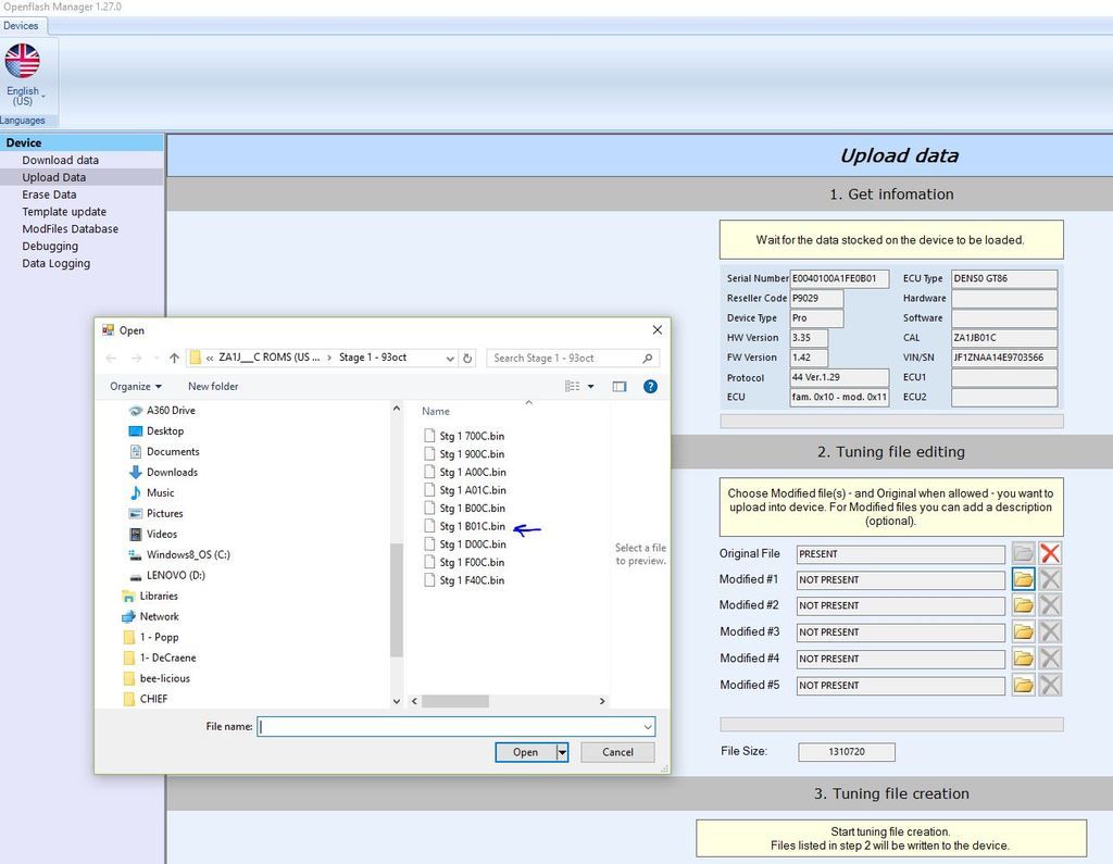 The rom is not stock. and its been calid adjusted. You should be able to load OFT B00C roms ok, these are the same tuning wise as B01C anyway. |