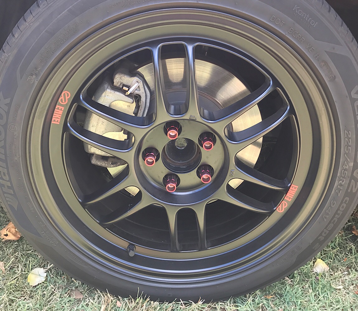 Up for grabs are my 2 month old Enkei RPF1s in a nice matte black finish. As mentioned in title specs are 17x8+45 offset and fit nicely with the stock suspension. Lookin to unload em cause I'm going on a summer trip soon. Only selling and shipping the wheels cause I still have the boxes for them so it's much easier to ship. Asking 800 shipped for them. I also have the muteki lugs for em, can throw those in for 850 total shipped. I'm located in NorCal for any local interest. Wheels are in 8.5 condition. One has some curb rash as seen in the pic and another a really small rock chip also shown, from daily driving. Nothing else is wrong with the wheels, no bends or cracks. Feel free to make any reasonable offer as well.