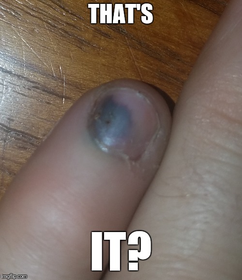 I got it working on a roof, in the mountains of NC, on a cold December day many years ago. I was hammering away, installing asphalt shingles in the semi dark trying to finish up the job when I felt something warm running down my hand. I had hit may hand with the hammer and instead of what you had I had split my finger open. My fingers were so cold I couldn't feel it, until it warmed up, then of course it hurt like an SOB. Probably needed stitches, but we just bandaged it up tight and let it grow back together. I still have partial feeling lose in the finger but the scar is barely visible.