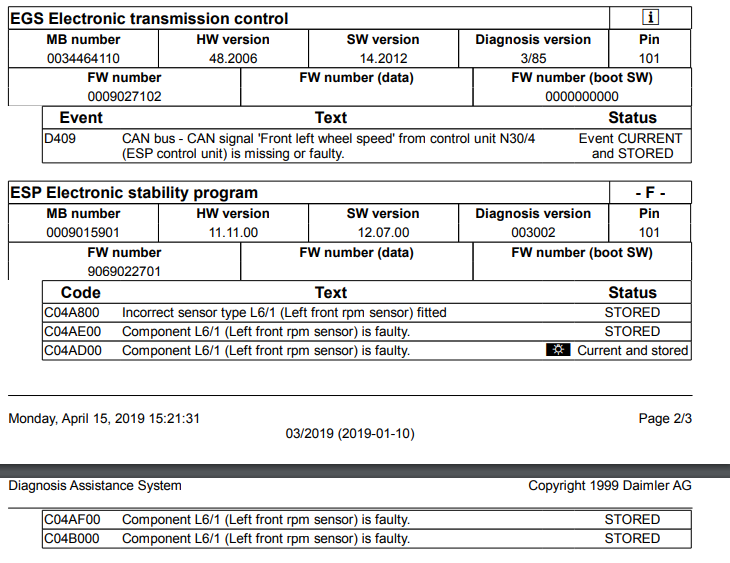 Current event in the transmission module, which could set a check engine lamp but did not in this case. Often you will have a code in the engine module for implausible CAN message received as well. The actual fault codes are in the ESP module. Without a real scanner you aren't getting this far. Some of our cars have 90+ control units. The vans are in the high 20s, low 30s. On this one, I replaced the LF wheel speed sensor. All lights still on, current faults. Lights were gone before I left the parking lot, codes were then stored and could be cleared. 5 different codes for a bad sensor, 4 with the exact same title. Silly Germans. Last edited by maslin; 04-16-2019 at 04:07 PM. |