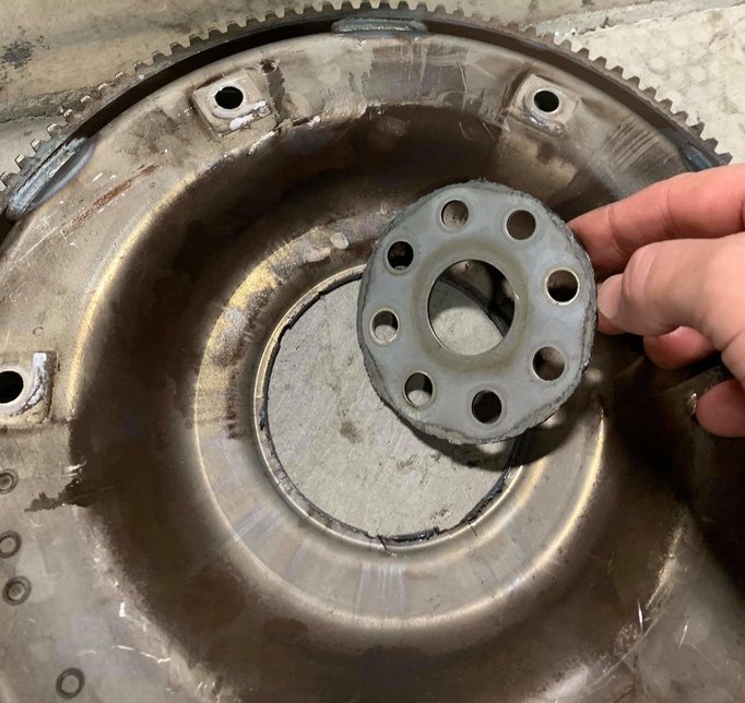 Flexplate cracked again, thinks I could have a bad transmission, or unbalanced crank. Also it was noticed that dowel pins were missing. From what I can tell from my limited google-ese, they're to align the tranny to the motor, I would imagine they would also limit the play going on. |