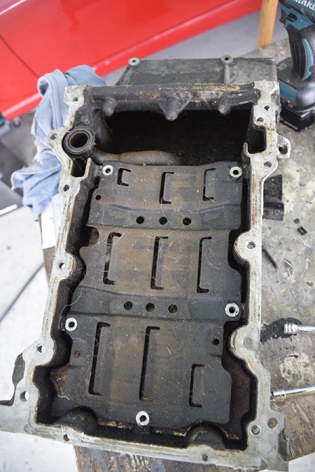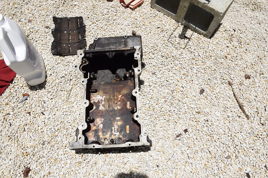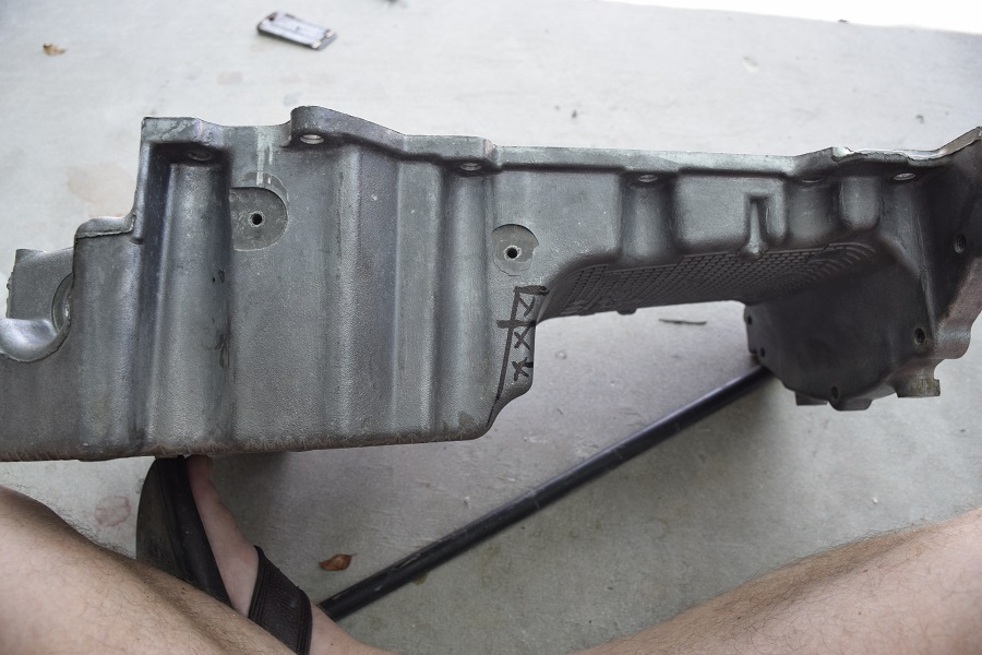 I've also come to the conclusion the oil pan is a bit too close (for comfort) to the sway bar. I had bought an additional Oil Pan some time back so spent some time working on it this weekend. First problem the pan was nasty,, and I do mean nasty. Opted to clean it up myself. Made a redneck hot tank and cooked it for 3-4 hours. Did pretty well but should of put more degreaser in it. Hit it with brake cleaner, small wire brush then pressure cleaned. All in all came out OK. OK for the modification. The back of the sump is just too close. You can see in the picture the area 'X'ed, just need 3/4" or so and I'll be happy. Like to have it cut up this week and sent out for welding.