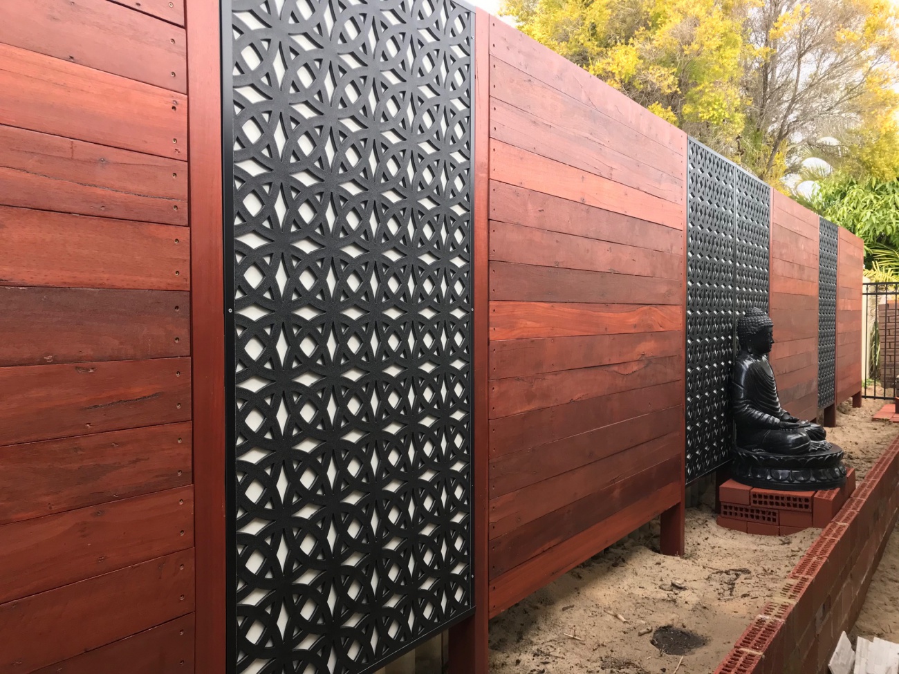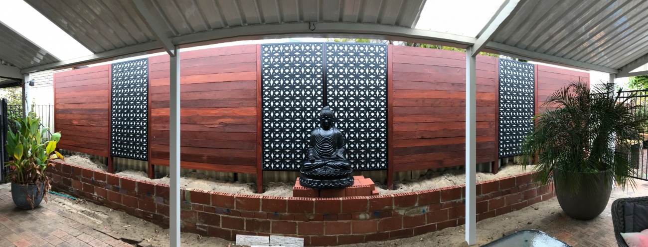 It is straight, I am just using the Panorama function on an iPhone from a central axis. Pic below shows from the side. BTW, I used recycled Jarrah floorboards. Just need to make a wooden platform for Buddha with the same theme, mulch, plants, paving and render the bricks... Good times ![]() |