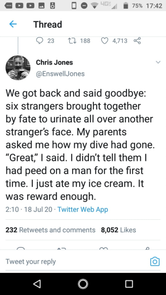 lol that was hilarious. I lost it at "He'd gone out a man who'd never been peed on. He was coming back knowing that he could never say that again."