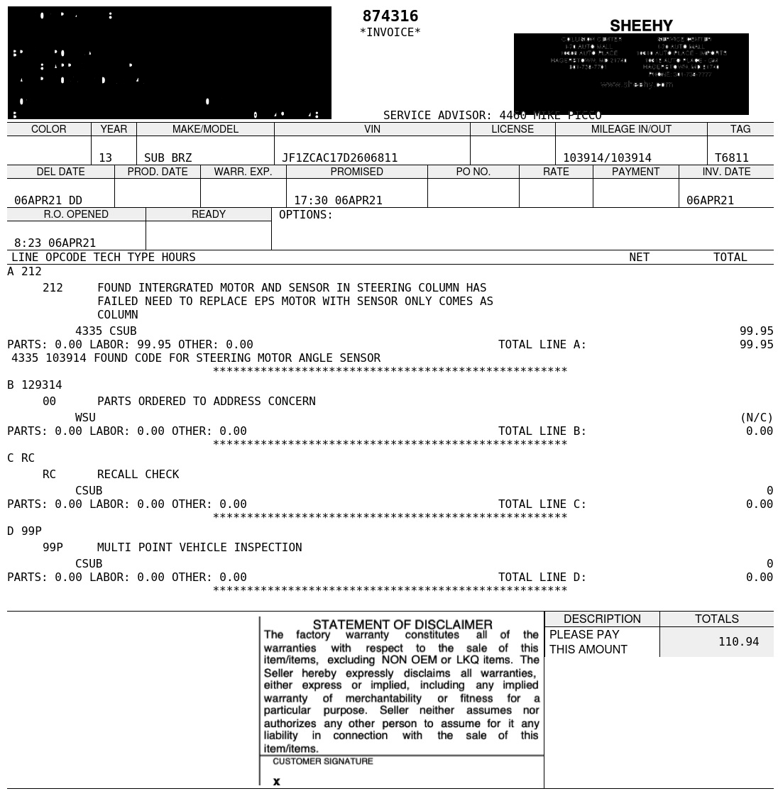 Hopefully Subaru pays well for the valve spring recall and the tech is feeling generous and I don't end up with a $1,000+ bill, but only time will tell what caused this EPS failure.