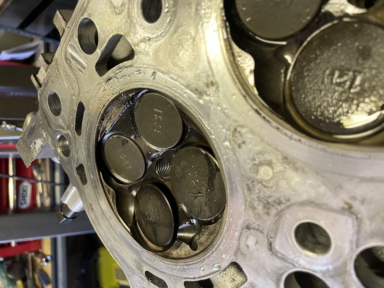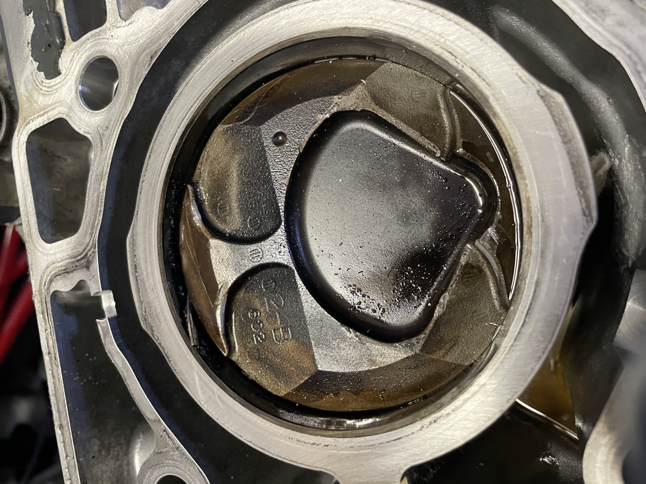 Second cylinder threw the rod, and the roller rockers seem to be missing. Digging further I found the valves bent open. Then I found the number 2 piston rings peeking from the top? Could this have been the grinding sound I heard? I thought it was a spinnibg bearing, but maybe this was it. As you guys can see, the piston is destroyed from the bottom. I still need to pull apart the block, but here is what could have happened: —My car wasn’t apart of the spring recall, but say something happened and the rockers were thrown, I feel like the spring would have closed the valves, and the rocker would ping-pong around the head, but it wouldn’t cause a problem. —I drive aggressive, but the car wasn’t being driven too aggressive with the gas, more with the cornering. It had only been running for five to ten minutes from my garage that was around 55-65 degrees is a best guess, as I was heading to work. I wasn’t driving it long enough for ring expansion to happen from heat. Maybe it is possible there was some type of detonation event that cause the ring to overheat and pop out, which is why I heard a pop/bang and then grinding. Then the piston got stuck and the rod ripped itself from the piston, which caused it to spin freely, ripping through the motor and breaking. —The other possibility is the rod snapped, and when the piston came down, it was struck by the rod, which broke the piston and caused it to impact the valves and twist in the sleeve, causing the rings to grind before the rod sent itself through the block. Maybe the block will reveal more.