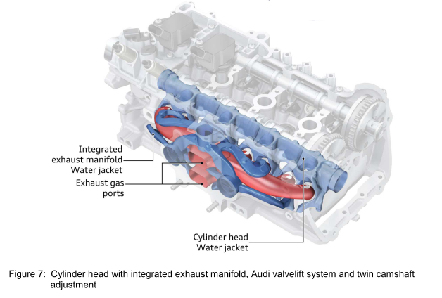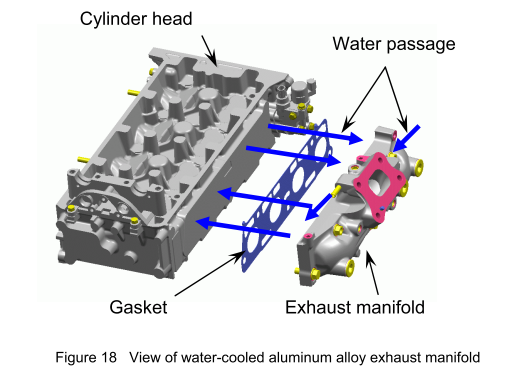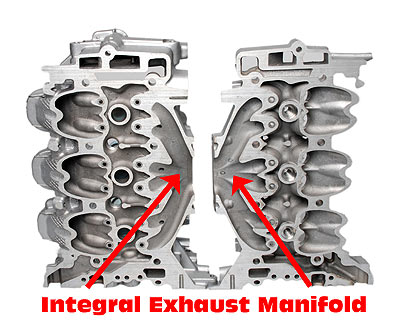 I have four examples for you, two non-turbo and two turbo. First is the Chrysler Pentastar V6 engine you find in all sorts of longitudinal configurations, like on the V6 Challenger. next is the Honda R18 engine used in a gazillion Civics third is the new EA888 1.8T VW engine for European markets that I have discussed in the past. This engine also features port + direct injection like the FA20: note that this manifold is aluminum and water-cooled. It's also cast into the head. The last example is the Honda K23A1 engine found in the outgoing RDX models. It's aluminum and water cooled, but it is not cast into the cylinder head: Quote: