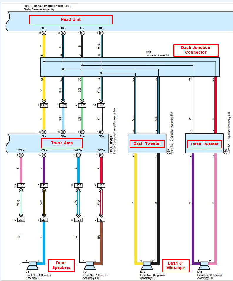 The following diagram shows how the dash and door speakers are wired. The dash tweeter and mid-range speakers are both 4 ohms. These two speakers are also essentially wired in parallel with the input to the trunk amp. Together, this presents a 2 ohm load to the HU (assuming the input impedance of the trunk amp is somewhat higher than 4 ohms - which is likely). So, the HU front speaker outputs are driving all six speakers with an amp between the head unit and the door speakers. This means that with factory wiring, whatever adjustments (tone, balance, delay, etc.) that you apply to the front HU output will be applied to all six speakers (Not ideal). If you want to deal with the dash and door speakers individually the best approach would be to run new wiring from the HU to the doors thus bypassing the factory amp in the trunk (FYI: Running new door wires is a bit of a challenge).
