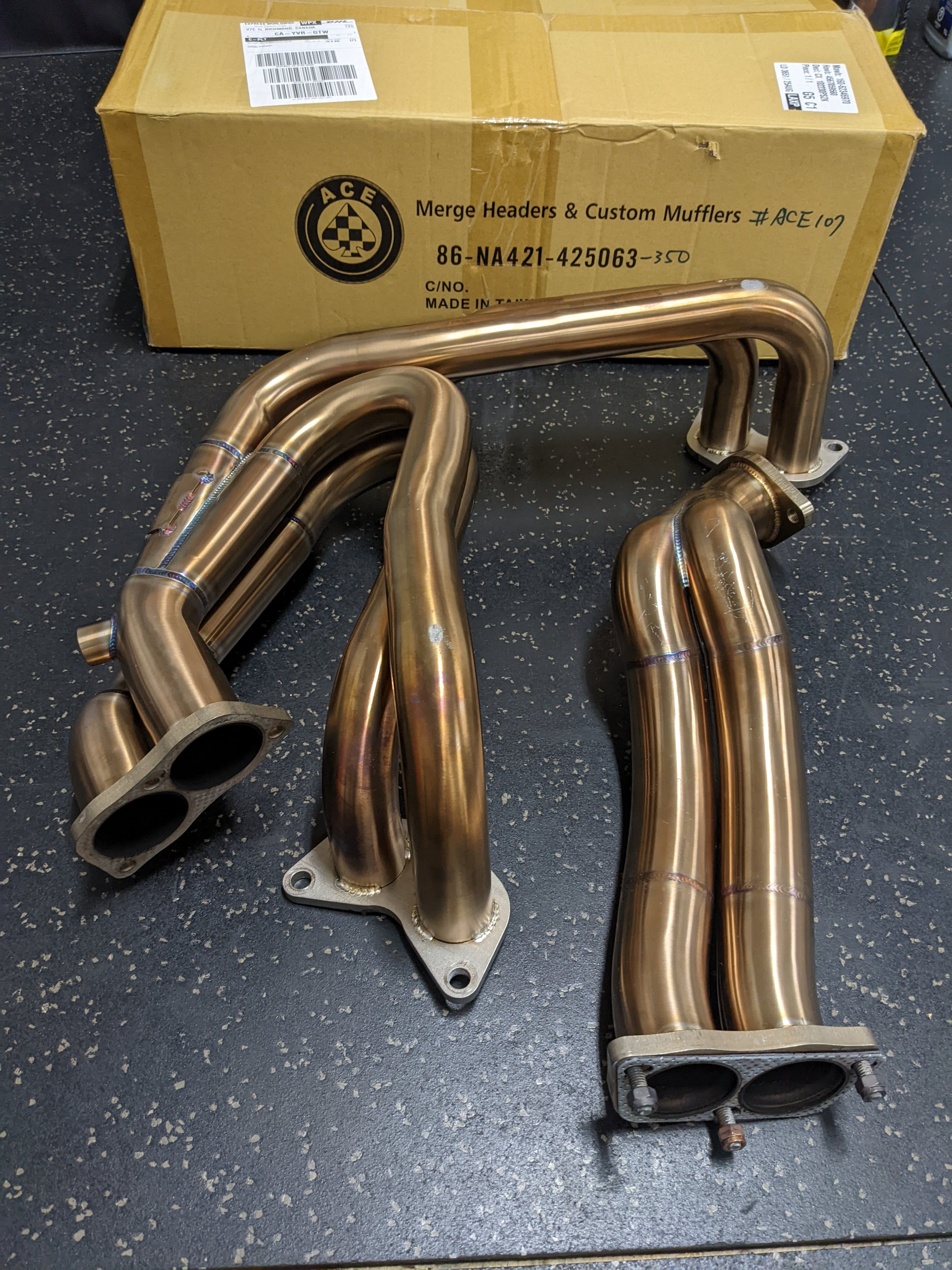 I bought the full ECUTEK kit with the RaceROM BRZ add-on so I can self-tune (courtesy of Zach @ CounterSpace Garage), and picked up a lightly-used set of ACE A350 headers (bought through the Member Classifieds on the forum from a local guy who has upgraded from a BRZ tS to a Supra). After receiving the ECUTEK gear from the UPS driver this morning, I already loaded up the license and stock ROM, configured the ECU Connect app and did my first couple of datalogs on my drive to/from picking up the headers this evening. I had *just* gotten to where I had resigned myself to sticking with the stock header for emissions and cost reasons when these popped up on the forum. These headers were what I had on my list of planned mods for years as I waffled back and forth over buying a BRZ, and then not long after I finally took the plunge and bought my car, they were discontinued! With their great condition and local availability (no shipping!), the deal on these was just too good for me to pass up. The seller even still had the original box and packing materials! ![]() Since I had to dig into some funds I had earmarked for debt reduction to jump on that deal, I've decided to "delay gratification" and wait until those debts are paid off (end of this year, maybe next February at the latest) before I'll allow myself to install the headers. That will also give me some time to figure out how I explain / justify them to my wife...LOL. Before I do that, I also need to invest in some STI motor mounts and rear transmission mount to minimize the chances of rubbing, etc. with that fat overpipe, and I'm also planning to get them ceramic coated locally before using them, even though I do really like the golden / copper colour of the heat-cycled stainless steel. That will all cost me another $500-600 or so, which I'm not going to incur more debt to do. A further upside, the seller also threw in some Whiteline diff mount inserts he had and a couple of bottles of Subaru coolant. I most likely won't use the inserts due to the increased NVH, but now I have the option, I guess! ![]() Here are some pics of the headers: With the original box! ![]() Man, those welds are GORGEOUS! ![]() ![]() Now on to learning the ins and outs of tuning this motor in stock form before I see what I can do with the headers and other mods I have planned...