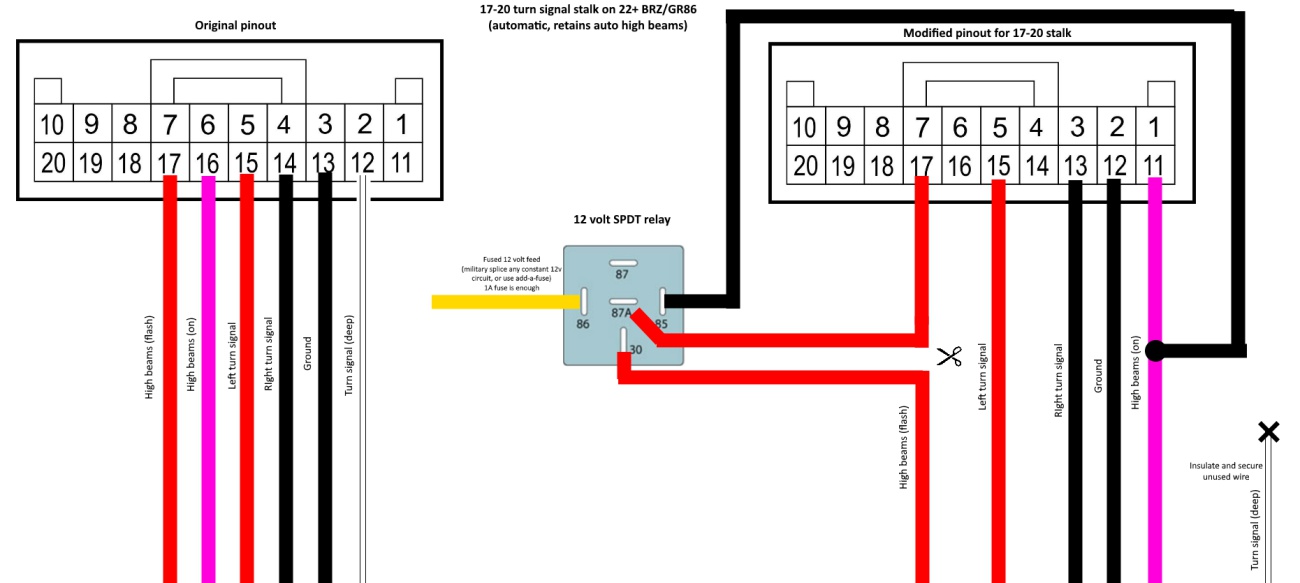 With the proper repin of the headlight harness, all functions work exactly as expected (including 3-blink lane change), with one minor caveat when it comes to the high beams. There are 2 differences: