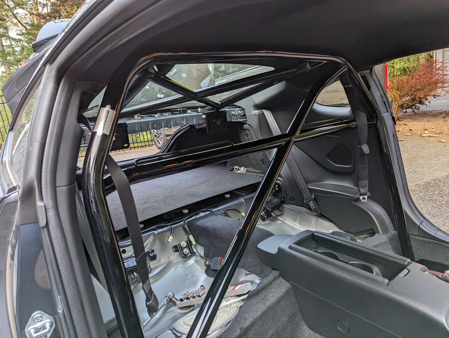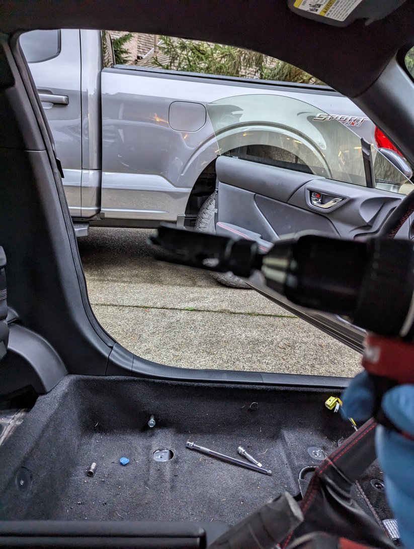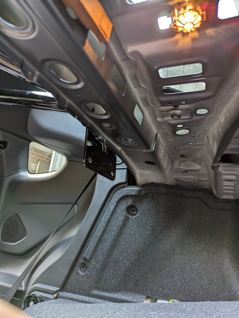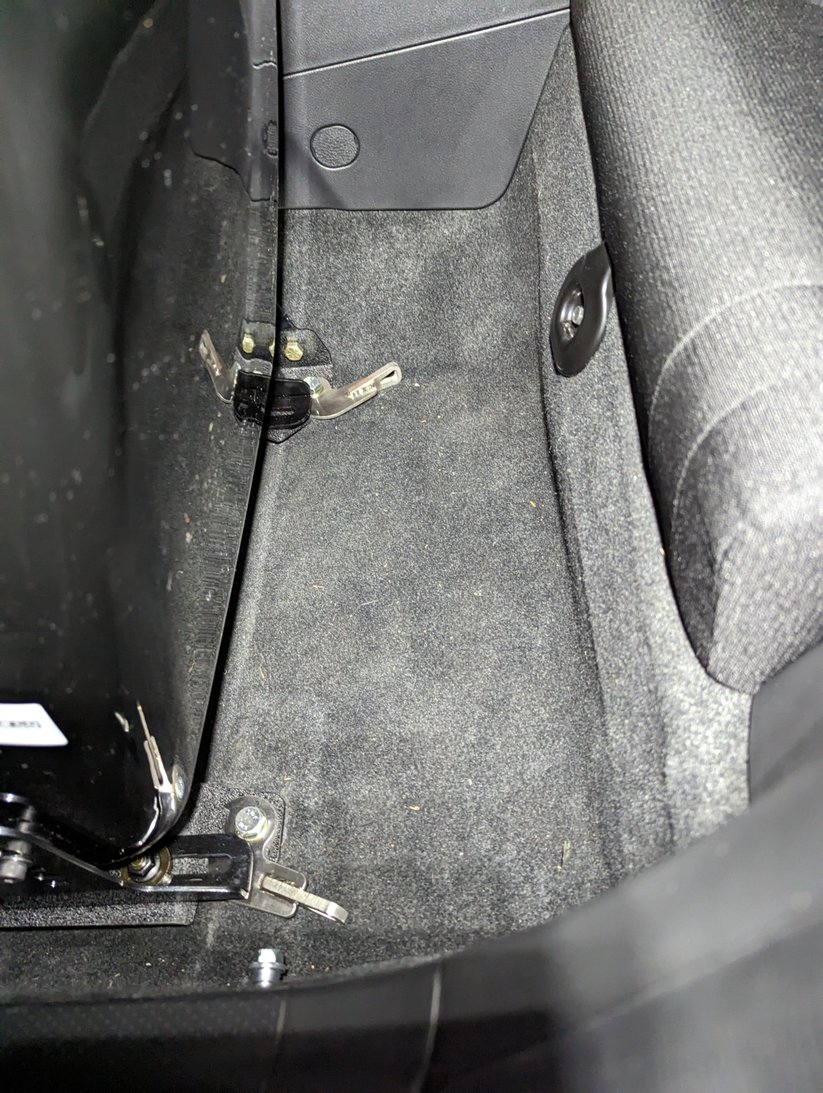 Much more roomy with stuff removed : ) Also had to remove that top cover. Apparently, TPMS unit is there. How it looks with the Titan half cage in. It has a nice wide footing that is snug to the floor. That said, it's not bolted by any means to the floor. This is common to RSR half cage, too. There is a nice boxed cross-member right by where it connects, but the actual bolt location is for child seat top anchors; they're not crash rated like the seat belt bolt locations. Also, the strength of that boxed/reinforced section is also suspect. The seat belts would be yanking on these two bolts all day. FYI, they're standard size to my surprise: 5/16-18 coarse tread. This is the rear mount of the RSR half cage; it connects to inner bolts of the shock towers. It's better in a way, but also not great. It comes to the shock tower bolt at a pretty steep angle. Thankfully, I do have a subject matter expert here in PNW, Doug, owner of Chase Race, and asked about these designs (Titan and RSR): Quote:
