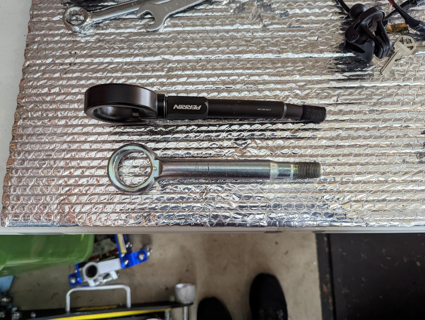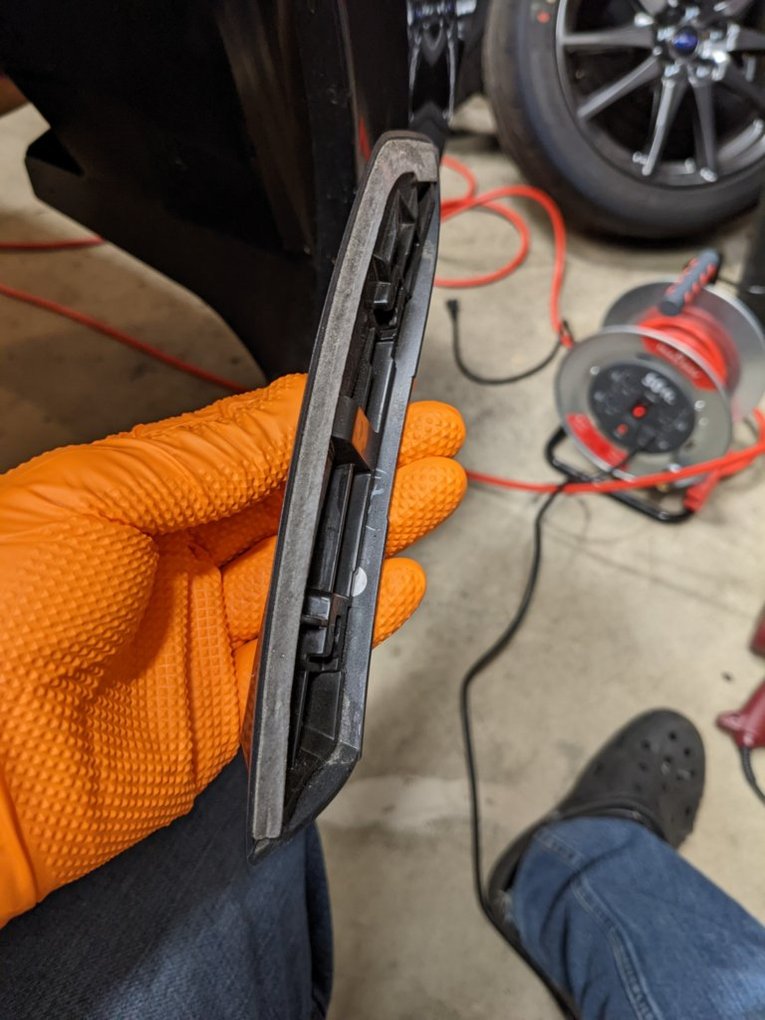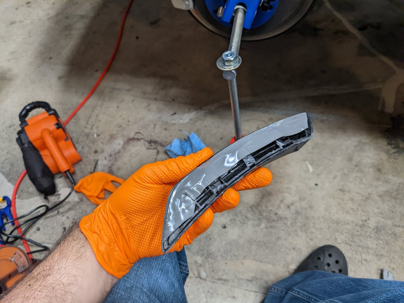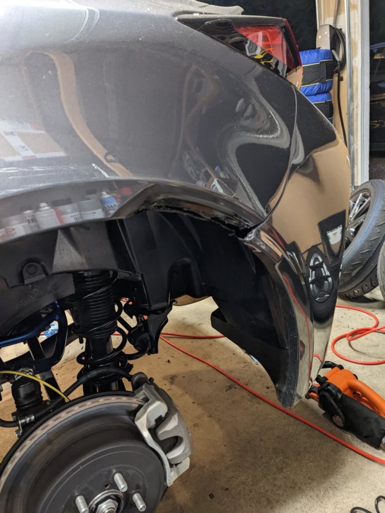 I'll be using wheel cribs for the quick height measurements as I work on the coilovers. Due to water extraction requirements, the garage floor is not completely flat, though. I have ABS sheets to use as spacer to balance it out. This should roughly work. The fine tuning will be done by the race shop anyway. I'll be measuring frokm the bottom lip of the wheel to fender, since I can never do it perfect from the center of the wheel, and I can always convert measurements used from the wheel center by offsetting them by 8.5". Next up, let's roll the fenders! I'll use 3M VHB to re-attach that plastic accent piece. The other side cut and painted with rustoleum. I have the roller tool. It was pretty easy. There's some kind of silicon by the lip. It came off as I rolled it. This is how the piece looks like. I trimmed the bottom section that sticks out. Trimmed the piece and put on the VHB tape. I'll leave it like this for a day to increase my 'odds' : ) Mildly rolled the fronts as well. The caliper is on the way for one side, and put a soft piece of paper to not hit it hard by mistake. I'll update with coilover install, soon.