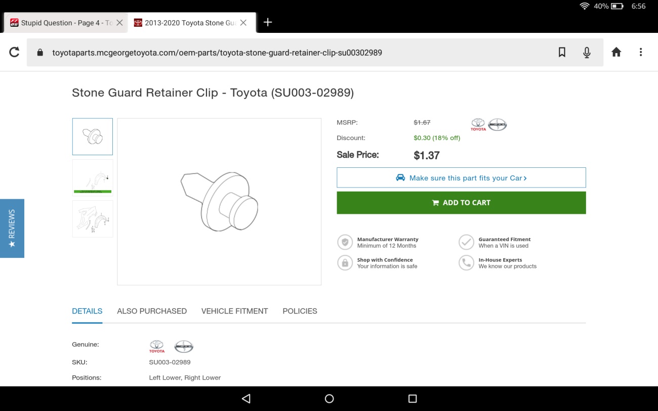 I call it the rubber thing in front of the rear tire. I noticed a couple months ago the one on the passenger side was missing the clip on the bottom. I went to Toyota and got a couple.