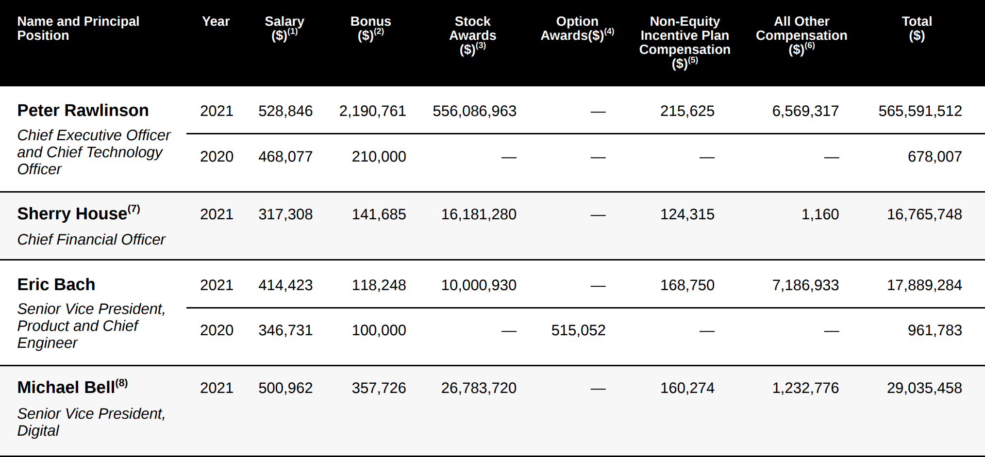 Unless I am mistaken about Lucid's CEO's stock awards, he could cash out tomorrow, and he would be hundreds of millions of dollars, if not almost a billion dollars, richer. This doesn't mean he will, but if things get too hard, or if he just loses motivation, there is little skin off his back unless the stock rapidly tanks overnight, but in general, this is poor management, IMO. You don't give a CEO $500 million in stock/cash when the company is only bringing in $150 million in revenue per quarter, stock is crashing 90%, and net loses are in the billions.Link
