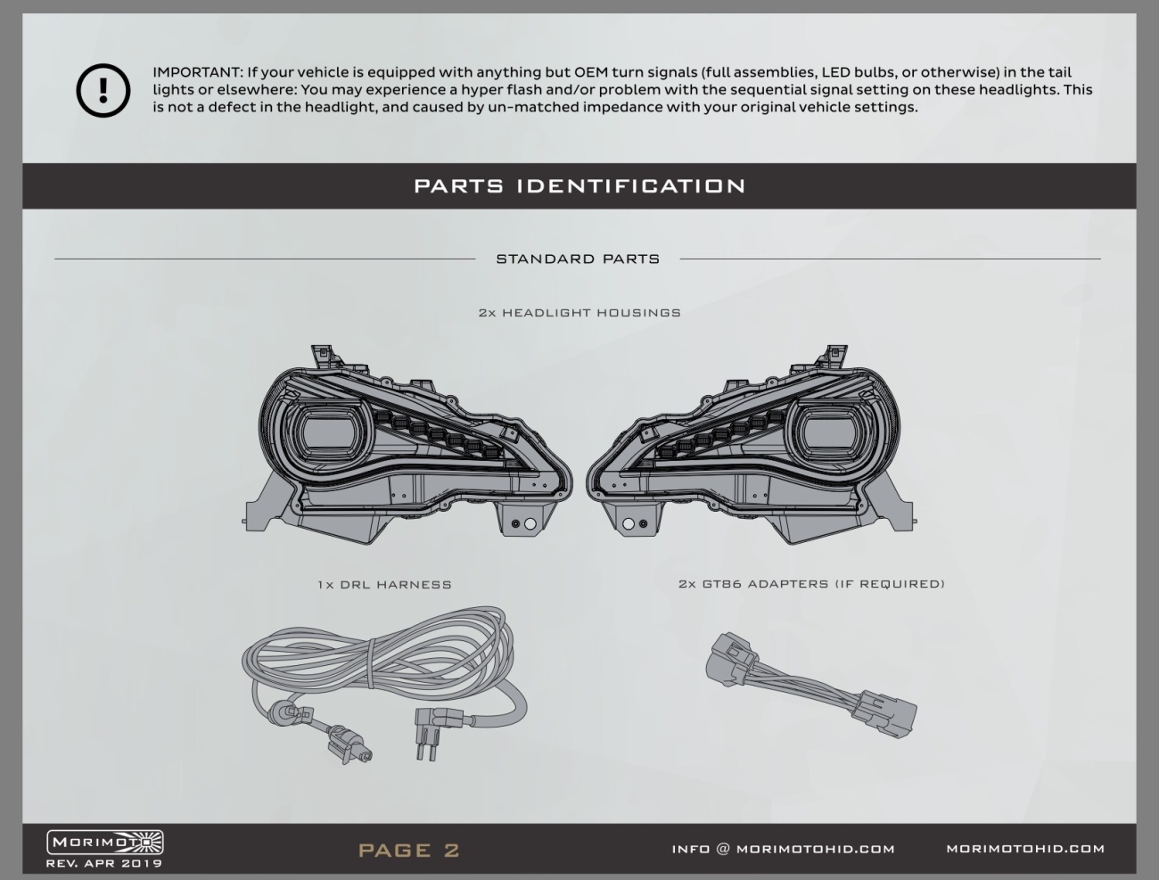 From ft86sf: OTE: "For the 2017 Toyota 86 model only the white and yellow pins on the headlight harness need to be switched for the turn signals to functional normally. Other models may require pin swapping as well. Quick swap plug and play harness is available for an additional cost."