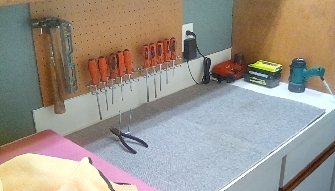 My little workbench area in the laundry room was looking pretty piled up with stuff. So I took everything out and am re-organising. First some peg board.
