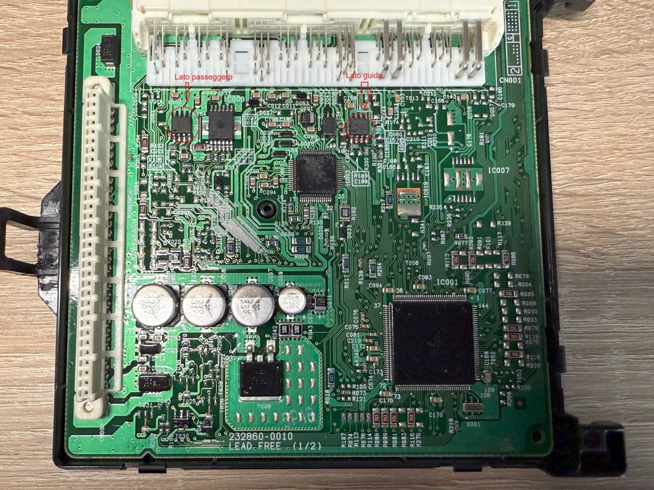 In particular, the IC you see in the photo (one for each side of the car , driver and passenger) which is called A1764 (213 is THE MANUFACTURER) is skipped. This IC is also present in the ESD system and in the ABS control units and manages the actuator solenoids.