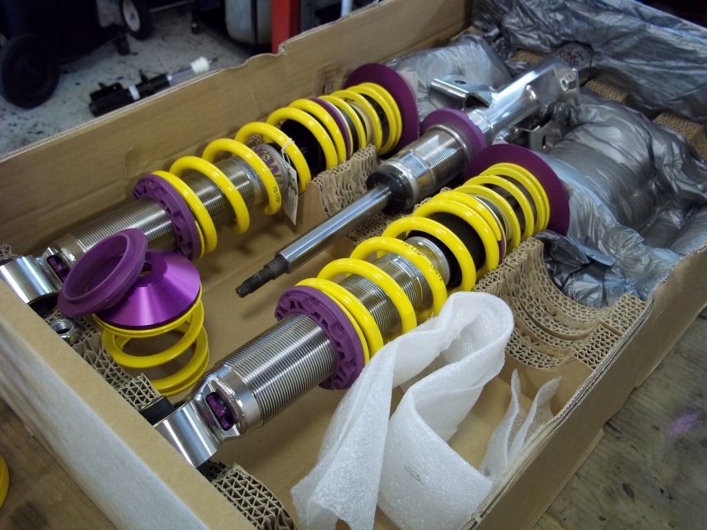 We received these beauties from KW Suspension: ![]() So we took the car over to our friends at Modern Auto to do the installation. Before... ![]() And after... ![]() We were really impressed with the quality of the KW parts! ![]() ![]() Checking tire fitment... ![]() More to come! |