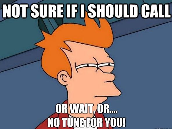 If you need a update, fill the form out. This is the only way I can manage 96 tunes. If you dont have any tune, then you need to call me. If your car is on fire - you need to call me. If you filled out the form and haven't heard anything in over a week - I suggest calling. If you called and I didn't pick up - I'm on the phone Try again in 30 min I dont need people walking on egg shells.. I also dont need to hear bitching. If you can't follow what i've said in this post then there is nothing else I can do for you. -John |