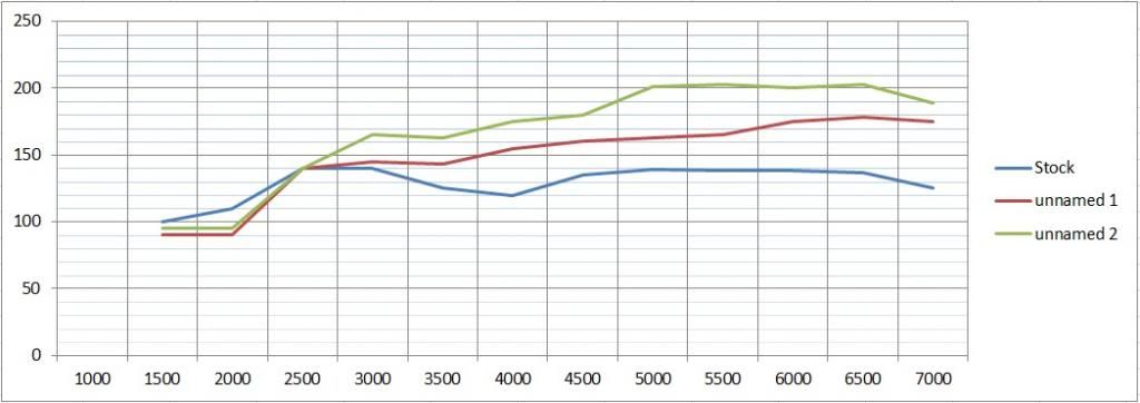 Ever since the revelation about your torque numbers I have been extra interested in your kit. Earlier in the thread I said 200 TQ is what I am looking for, and it sounds like you delivered on that hope over a wide RPM range. If your baseline was 150 TQ on the nose, 33% more TQ will solve any power problems for me I think.