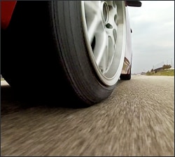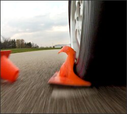 Tires tested: Dunlop Direzza Sport Z1 Star Spec (Extreme Performance Summer) Dunlop Direzza ZII (Extreme Performance Summer) Vehicles used: 2012 BMW F30 328i Sedan In the Extreme Performance Summer tire category, the Dunlop Direzza Sport Z1 Star Spec has a strong following among driving enthusiasts, autocrossers and track-day drivers. And it's for good reason — this tire has a reputation for delivering impressive dry traction and well-balanced capability in all directions of the friction circle — cornering, acceleration and braking. All this packed in a tire that you really can drive to and from the track. When rumblings of its replacement began to surface in the summer of 2012, fans of the Direzza Sport Z1 Star Spec debated the pros and cons of any change while they waited to see if Dunlop could find performance improvements without losing the good in an already great tire. Dunlop's development target was simple if not easy: improve dry traction and handling without sacrificing any of the wet or wear characteristics of the Direzza Sport Z1 Star Spec. Pavement-eye view of the Direzza ZII cornering hard.What Dunlop came up with is simply called the Direzza ZII. Short and straight to the point, the ZII looks the part of a dry track performer that begs to be driven hard, with a more solid tread pattern than the Z1 Star Spec. Dunlop is bringing the Direzza ZII to North America in early 2013, and when it arrives we'll do a comprehensive road and track test to find out how it compares with other tires in the category. In the meantime Dunlop brought us a set of production-spec tires to try out before we closed our test track for the season. We also pulled a set of Z1 Star Specs off the shelf to benchmark the ZII and get an idea of how well Dunlop hit their mark. As the autumn afternoon temperatures hovered around 60° F we set cold tire pressures to our standard tire test setting of 35psi front/rear, and scuffed in both sets of tires to wear off any mold release. We then got started by running some baseline laps on the Direzza Sport Z1 Star Spec. True to the tire's performance in past tests, this tire goes about its business with minimal fanfare and rewards a smooth driving style. In many instances the balance of the car with Direzza Sport Z1 Star Spec tires has just enough rotation at the rear to help the car glide around the corner, requiring minimal steering input to manage the few degrees of drift. Aggressive or early throttle input powering away from the corner can create a little power-on oversteer, however. Steering behavior is relatively good as the tire drives down to the apex, but you have to lead it just a little bit or risk falling behind when multiple steering inputs are required. Maneuvers such as the multiple side-to-side inputs of our five-cone slalom, as well as the right-left-right of our increasing radius S-turns, reveals the one potential weakness of the Z1 Star Spec, where the rear can get out of phase with the front, resulting in some transitional oversteer if not driven smoothly. Earlier and smaller steering inputs help tame it, as does keeping some weight on the rear tires. Avoid big speed adjustments mid-slalom or risk the tail wagging the dog. Direzza ZII's quick steering response had us driving over apex cones.With the Direzza Sport Z1 Star Spec tires still warm from their exercise, we hopped into another of our test cars shod with the Direzza ZII tires and set off to see what they have. From the first turn it was apparent this isn't the same tire. The Direzza ZII displayed noticeably more direct and positive steering response from the front tires. So much in fact, that we ran over a few apex cones in the first half of the first lap due to how the car was now diving to the apex with real authority. Lateral stability through the slalom was noticeably better, with a considerable improvement in composure at the rear of the car. Acceleration traction was noticeably better too, as this tire let us use much more of the torque of our turbo'd BMW 3 series test car, allowing for harder and earlier throttle application that results in forward progress, not sideways motion as might happen with the Z1 Star Spec. It's hard to say that the Direzza ZII has significantly more steady-state lateral grip than the Z1 Star Spec, but it does use what it has much more effectively. This pumps up driver confidence in rapid transitions and high speed maneuvers, resulting in higher velocity and lower lap times. We then turned on the track's sprinkler system to make a quick assessment of wet performance. Once the track was thoroughly soaked we had time in the schedule for just a few laps on each tire. Here the Direzza ZII again showed a noticeable advantage over the Direzza Sport Z1 Star Spec. The steady-state overall grip level was similar, but the ZII was much more predictable at the limit, with noticeably better communication of where the limit is, along with faster recovery once any slide began. It was just plain easier to go faster with the Direzza ZII. Dry Avg. Lap Wet Avg. Lap Dunlop Direzza Sport Z1 Star Spec 29.56 35.00 Dunlop Direzza ZII 29.08 33.84 Time Difference -0.48 -1.16