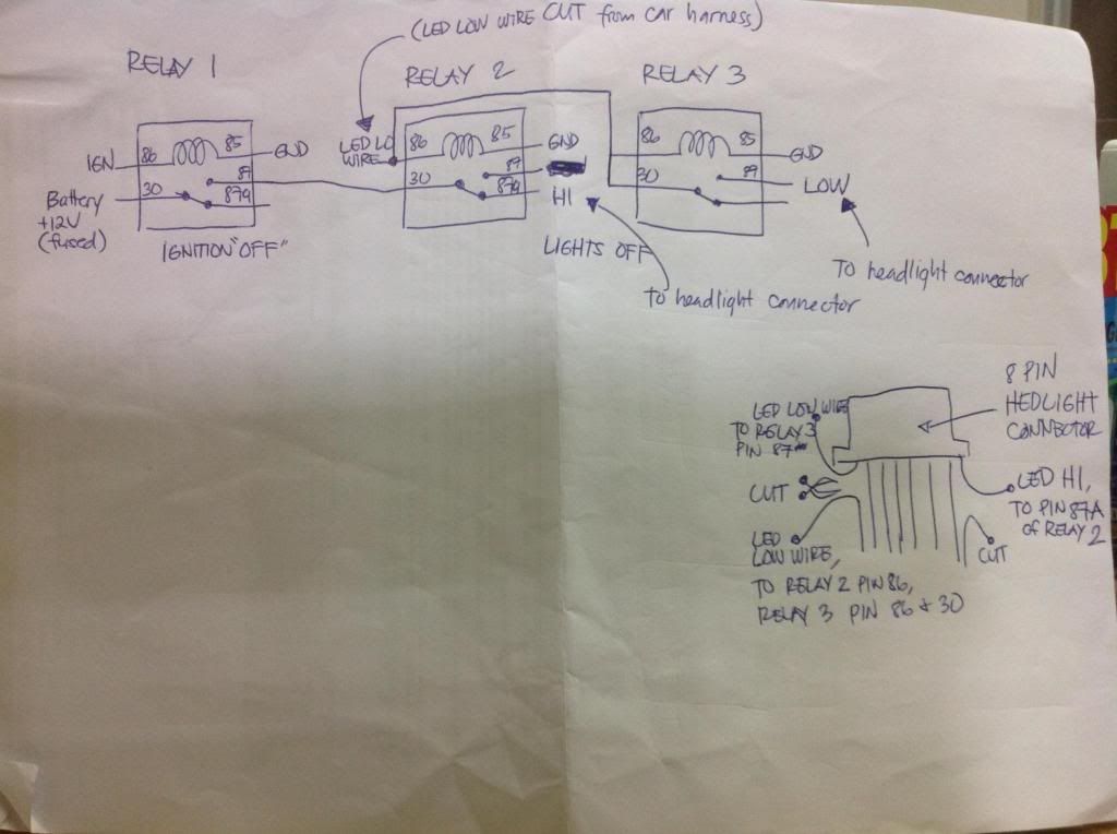 Sav, I saw the relay diagram you posted on the other thread. You really should be running a fused +12V line from the battery to power the LED HI, instead of running it off the ignition wire. Here's a diagram I sketched. Take note that nothing is connected to 87 of relay 2 and 87a of relay 3, this is very important