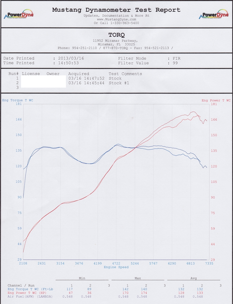 Looking at the results off the dynojet sheet... I made about the same with the motiv hfc and op. stock filter. I have a dyno sheet ill post when I get back home. After I got the tune it pulled 188hp. Oil temperatures were pretty high, considering I did a 4 hr drive to get it tuned...and I added a works drop in filter after that. I should be at about 190 now. Again ill post my dyno sheet later when I get home.
