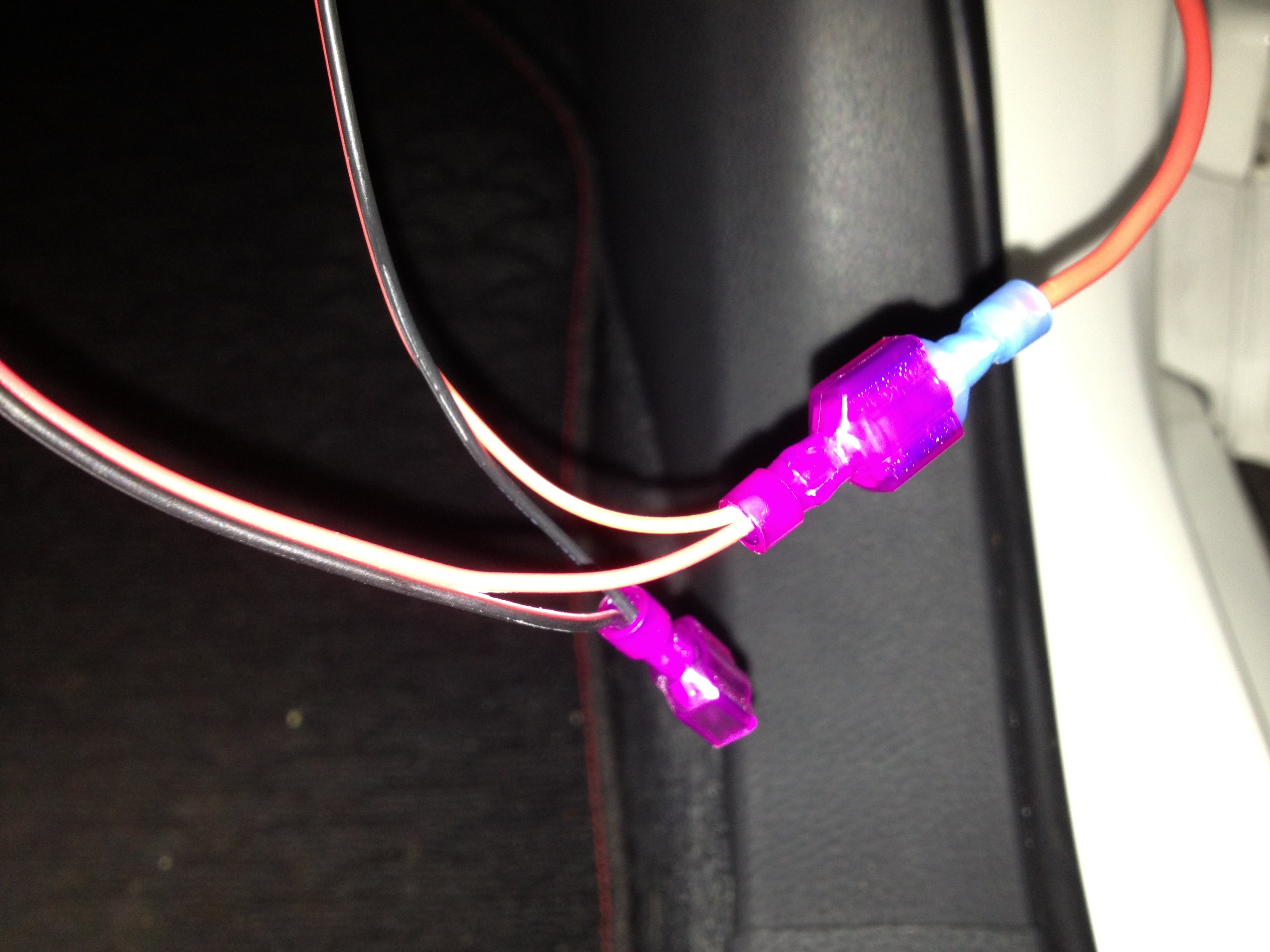 Here is the switch I used: https://www.superbrightleds.com/sear...T%20ON-OFF-ON/ In fact, you probably could do this for a lot cheaper buying all the pieces yourself from there directly, but I had the Phasetek set up so I modified it. IMPORTANT NOTE: I highly recommend disconnecting the negative terminal of the battery before doing anything. Obligatory I am not responsible for anything you do note. So, to get the footwell light to turn on when the doors open, I chose to tap the line going into the dome light: ![]() The way the dome light works is the middle green wire is from the battery, the black wire is a permanent ground, and the pink wire is an alternate ground which is controlled by the ECU. The pink one is the one which is connected when the doors are opened. So, I tapped the pink wire and ran a wire along the ceiling, down the passenger side pillar, and behind the glove box. I also put an inline fuse here. The pink line has no fuse, and if you short it, it will fry the connector at the ECU, then the dome lights will never go on with the doors open unless you get a new ECU. Another good reason to disconnect the battery before fiddling. The STDP Switch is then used to switch from the pink line ground, to a permanent ground which is attached to the chassis anywhere. I chose this bolt which is under the panel directly below the drivers side knee pad because it was close to where I decided to put the switch. ![]() The switch has three connectors, the middle one goes to the LED light assembly, and each side is the two different ground lines. NOte: MOst switches are STSP, that is just on-off. This one is STDP, that is it has on - off - on. ![]() ![]() For power, I used a fuse tap which always draws power, even when there is no key in the ignition: http://u.cubeupload.com/Chaetagnath/8bfIMG0600.jpg It's kind of hard to see, but its the second slot down from that side. The LED light wiring from Phasetek has two connectors, one is power, the other is ground, and then they split out to each LED. ![]() So the power is plugged in in that picture, and the middle wire from the switch plugs into the other tap in the picture. Then, I installed the switch in the panel below the driver side knee pad. ![]() And it looks awesome