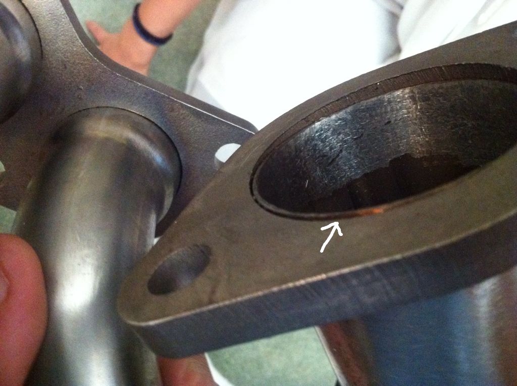 The 2 bolt flange is pictured here, the bolt ears are warped outwards, and the pipe inside is actually sticking out PAST the flange about .35mm In the second picture you can see the pipe sticking past, and you can also barely see it in the first ![]() ![]() The other side of the flange ![]() This isn't too bad, I think it should seal up.... but still, flanges should be FLAT. ![]() This concerns me, I do not have any gaskets to test with, but it almost looks like this area that has been ground down is very close to where the fire ring on the gasket will seal. ![]() Opinions... should I try to run this or ask for another replacement? ::edit Another fun fact, the 2 flanges that bolt up to the head are not even. If you place the header flanges down on a straight table (marble, thick glass, etc.) one flange will lay flat on the surface and the other one will only have a corner touching. The flex pipes will take care of that I suppose, but it makes me a little dissapointicus as the flex pipes will then always be "tweaked" to take up the insconsistancy |