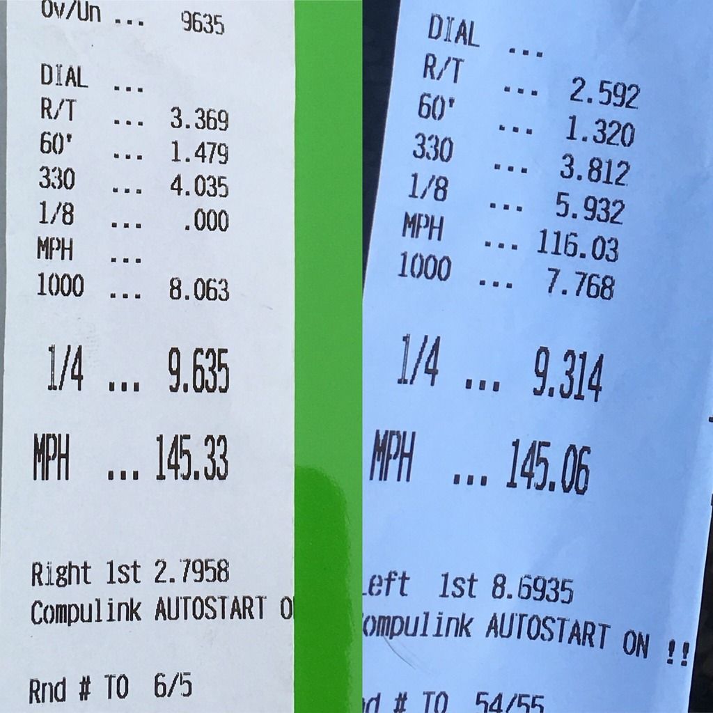 We had a great weekend at MDIR, the weather was good except for Saturday. The car set a new chassis record! We qualified but got knocked out in round 1 in a close race. Thank you so much to everyone that helped me out, it means alot to have your support. We had a 9.6 @ 145, a 9.4 @ 145, a 9.5 @ 144, and our best was a 9.2 @ 150 ! We will go 8's next year !