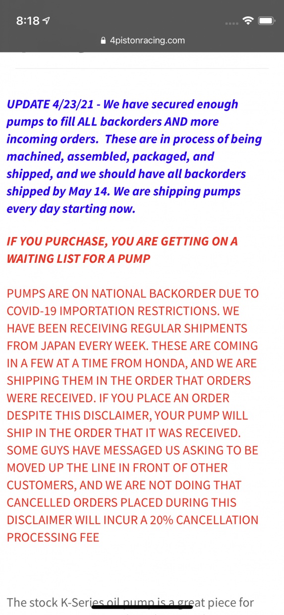 RSX Type-S oil pumps are in short supply like many things. KPower is prioritizing selling these to people who bought their swap kits, and I’m 98% sure it is required to use their oil pan. FYI.