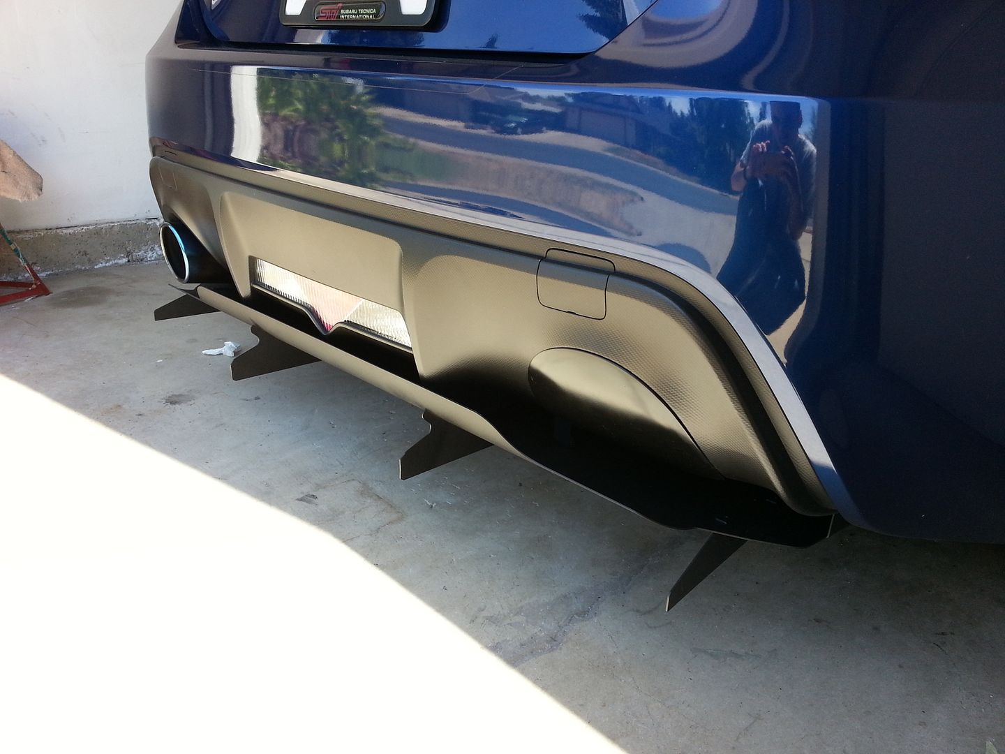 Note: I don't mind at all modifying something like this, I do it all the time. The big reason I bought this diffuser over all the others is how it curves around the bumper and does a much better job completing the rear end. This is the area I cut out: ![]() Plenty of room now: ![]() ![]() The diffuser is now completely flush up against the car, no spacers needed!!! YAY! ![]() I also cut off about 1.5" from the two middle strakes, they were scrapping on my driveway (The only place I've scraped with them so far too... oh well, still looks good)