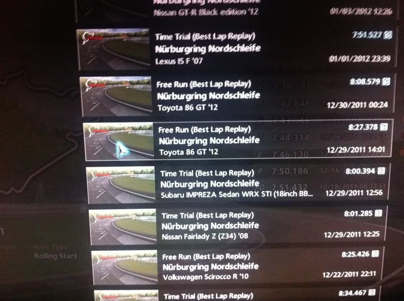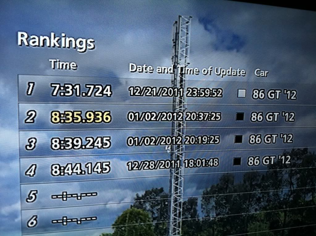 Pretty sure it's possible for me to shave at least a second if i try some more. ![]() All of the other time attacks in the SS are with stock settings (or default settings in the case of the tuner cars) except of course for the other GT 86 that has like 50 more HP than stock. i wanted to see how it compared to a 370 and It still can't touch a 370 Z by a long shot even with ~50 more HP (no other tunes where made for that except for engine performance though) That said... i think i'm on top for now by quite a bit: 8:27.378 Fully stock, MT, 2 ABS, no TC, and all other settings as required. ^________^ You know what they say about records though |