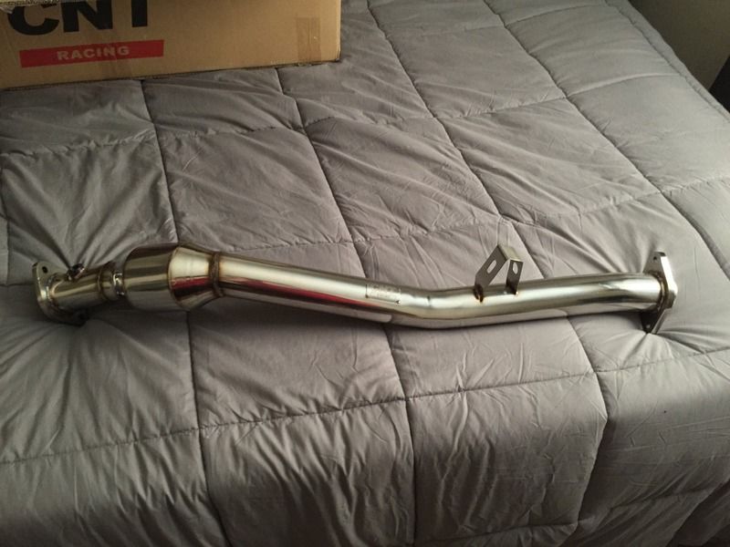 Got the CNT Racing Catted Front Pipe on this afternoon. I also swapped in Grimmspeed 5 layer gaskets at the Header/Overpipe and Overpipe/Frontpipe junction. Car's resting now...First start in a few minutes. I'm expecting it to be ungodly loud at this point. Now I just need to do something about that midpipe. I'm thinking I may do the WORKS midpipe and then the Nameless Muffled Track Pipe but that is close to the price of the Tanabe Concept G and a few other single exit catbacks so I may go that route. Not sure yet.