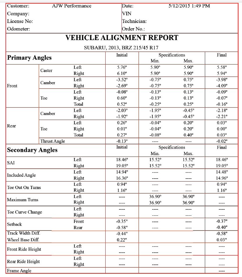 Below are the alignment specs (click the attachment) as well as some photos of the BRZ crash bar. We may be offering this crashbar for sale soon! You will need to cut your fender lines just a bit to utilize it without the bumper, so please keep that in mind! We will have further updates soon, the new clutch just came in and will be installed soon!
