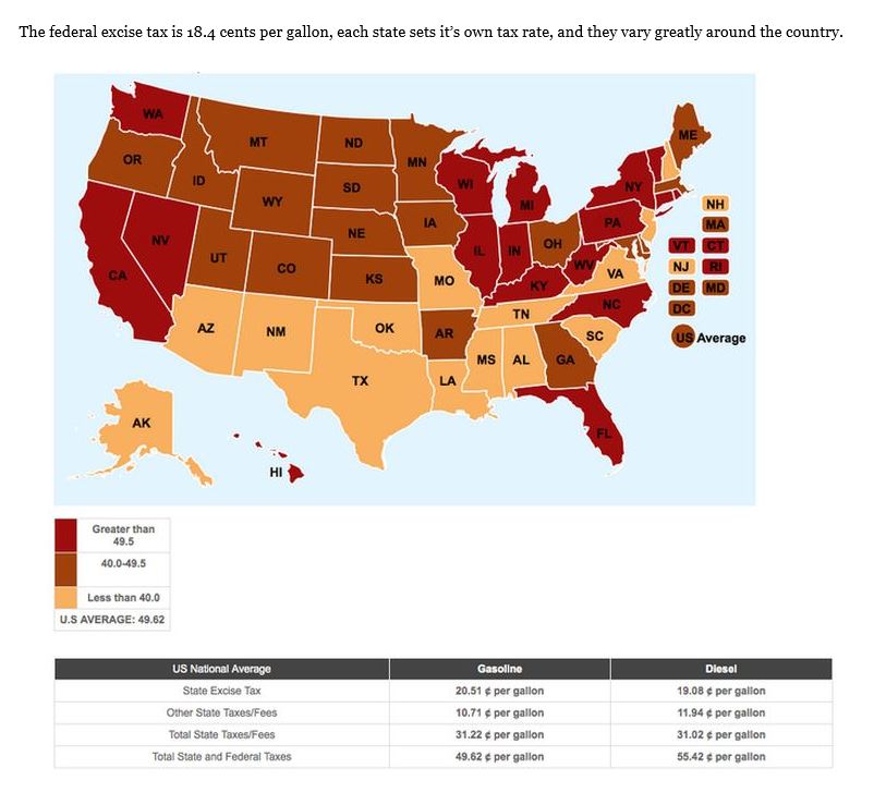 In the US, for example, the state sales tax on fuel ranges from below 40cents per gallon to 50cents or more. On average, if the fuel was completely free, it would still cost you around 49 cents per gallon in federal and local taxes.