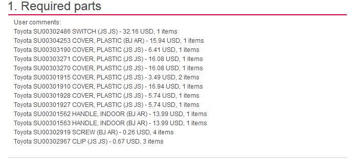 So that this is all in one place rather than 3 posts. Here is my order list: 1 COVER, PLASTIC Toyota SU00303270 1 - Right door handle 2 COVER, PLASTIC Toyota SU00303271 1 - Left door handle 3 HANDLE, INDOOR Toyota SU00301562 1 - Right door lever (with lock) 4 HANDLE, INDOOR Toyota SU00301563 1 - Left door lever (with lock) 5 COVER, PLASTIC Toyota SU00301927 1 - Right Knee Pad garnish 6 COVER, PLASTIC Toyota SU00301928 1 - Left Knee Pad garnish 7 COVER, PLASTIC Toyota SU00301932 1 - Dash trim (passenger dash) 8 COVER, PLASTIC Toyota SU00301910 1 - Dash trim (radio surround) 9 COVER, PLASTIC Toyota SU00303190 1 - Shifter surround 10 COVER, PLASTIC Toyota SU00301915 2 - AC vent covers. (you need 2 of these) 11 COVER, PLASTIC Toyota SU00304253 1 - Steering wheel trim 12 SWITCH Toyota SU00302486 1 - Buttons (traction control/sport) (manual) 13 CLIP Toyota SU00302967 5 - Extra clips Total price was $205, shipping was $42, they didn't ask for a VIN. I got this set of tools from Amazon for $20. I only used about 3-4 tools, so a smaller set would probably work just fine: [ame="http://www.amazon.com/Astro-Pneumatic-4524-Fastener-11-Piece/dp/B005NMCE04/ref=sr_1_6?ie=UTF8&qid=1367544089&sr=8-6&keywords=dash+removal+tool"]Astro Pneumatic 4524 Auto Fastener and Molding Removal Tool Set, 11-Piece - Amazon.com[/ame] Some DIYs and videos that helped me: Door card removal: http://www.ft86club.com/forums/showthread.php?t=12520 Once you get the screws out, don't be afraid to just pop the door off with medium force. Start at the edge where you removed the push lock. The door handle comes out easy enough, you just unmount the cables from the handle and then they slide right out. Inner HVAC garnish: http://www.ft86club.com/forums/showthread.php?t=13583 Just use the JDM knee pad removal DIY since you need to do all that to get to the garnish. It was the longest part of the install. Vent rings: Just get a tool under them and pop them off. Door handle garnish: See Door card removal. Radio/dash panel: See JDM knee pad DIY. Of note, the radio piece needs to be flexed a bit on the bottom to line the tab up so that it inserts back into the dash. If you snap it right in it will look like it doesn't cover the gap between the HVAC panel and the radio. Sport/Trac buttons: See JDM knee pad DIY. Shifter garnish: See JDM knee pad DIY.