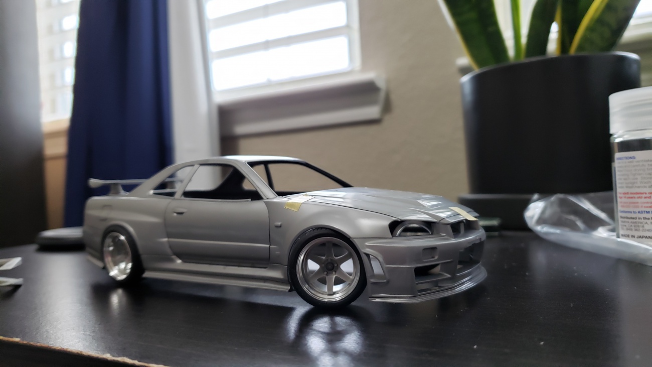 Pink primer on the interior since Tamiya flat red is still on back order, so can't finish the interior until that arrives. Plus I'm waiting on front seats (using the Z-Tune front seats in the R33 build). |