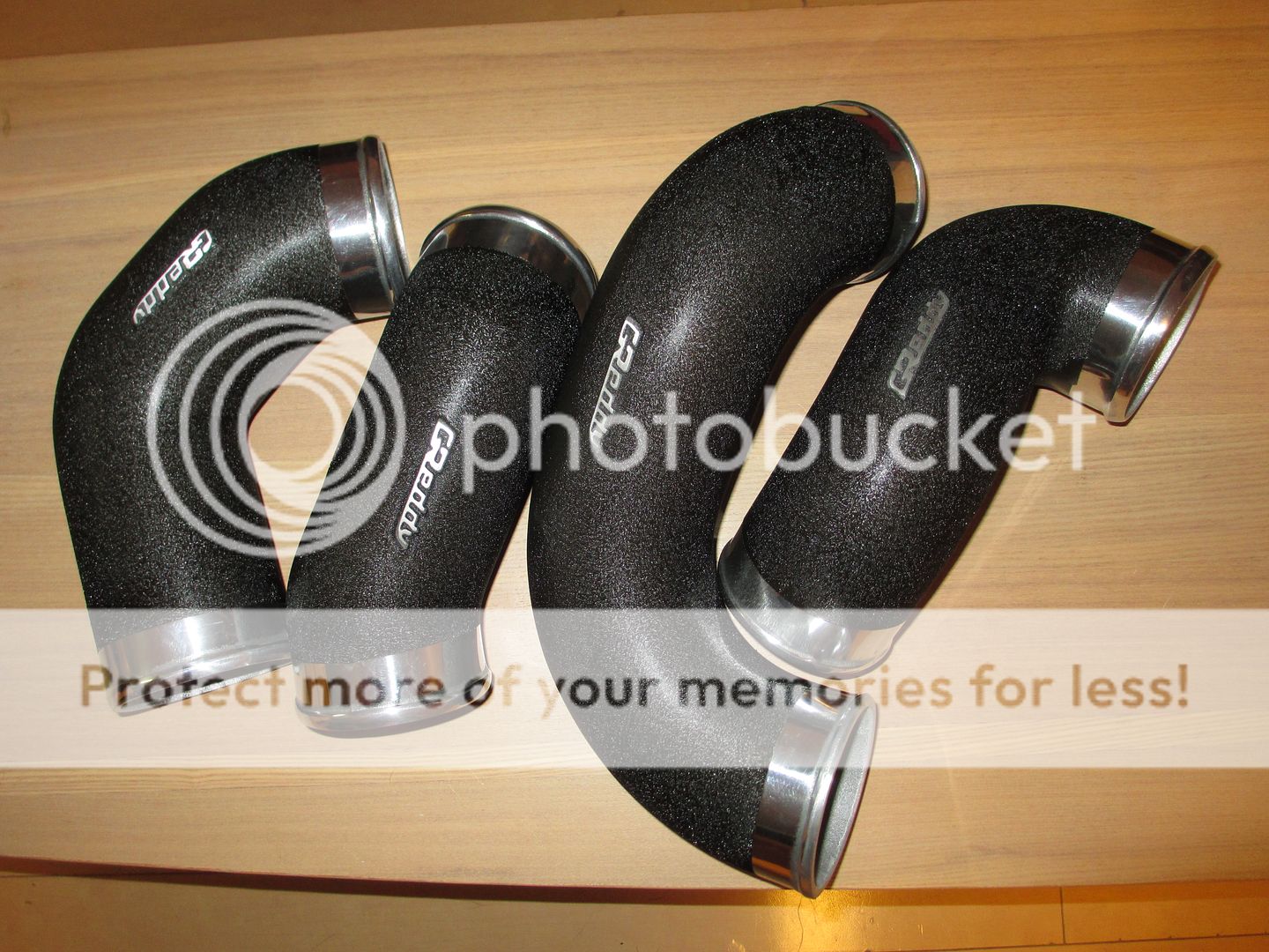 I have been on the fence about doing the intercooler pipes in the same wrinkle black. I came down off the fence and had them done. The GT-R has a mess of pipes and couplers, and twin blow off valve mounts and mess like that; a lot of it long rubber hoses. It looks like crap and it's not good enough. I picked up the Greddy hard pipe kit which replaces a majority of the pipe and hose run with smooth highly polished cast pipes with silicone couplers. They look great right out of the box.
