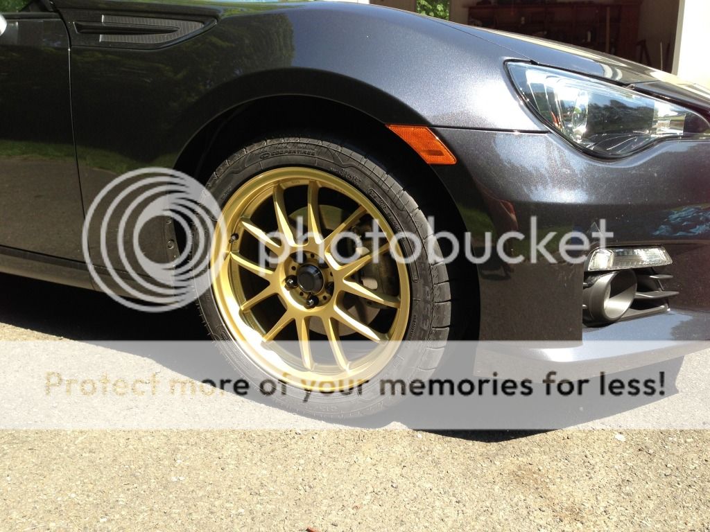 I hope to have the wheels on my car before the end of the week. I will post in this thread when I do. Here are some pictures of the wheels for now. They have a darker powder coated gold paint than the pictures show, definitely darker than the stock photos you see online. The stock photos almost make them look like they are a matte light gold ano, they are gloss. There is no KONIG name on the rim, just the center cap and "RACING DESIGN" on the outter edge. I originally had planned on running the wheels without the center caps to get rid of the chrome on gold (thats why i ordered black lug nuts), but since they used a chrome valve stem anyways, I think I am going to just leave the cap in. Let me know what you think, these will be going on a dark gray metallic BRZ.