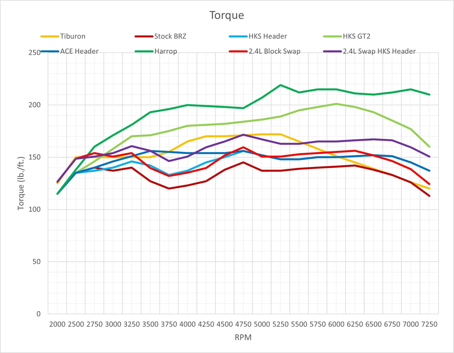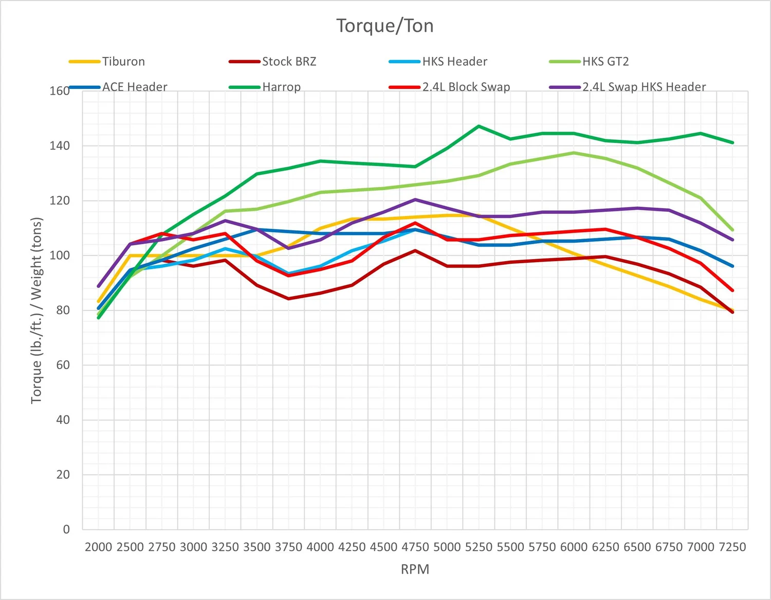 ![]() Torque Per Ton (2000 lbs.) Curb Weight Chart ![]() These two are just the raw torque numbers, and the raw torque per ton of curb weight. No surprise, the stock BRZ is WAY below the 2.7L V6 Tiburon on raw numbers until the very upper reaches of the rev range. With weight taken into account, it pretty much agrees with my seat-of-the-pants feel comparing the stock BRZ and the Tiburon as they pull through the revs - it feels pretty close until the BRZ hits the torque dip at 3250 rpm, and then from there until about 6000 rpm the Tiburon just crushes it. A bit disappointing to see that even the unicorn ACE A350 header falls behind the Tiburon from 4000-5750 rpm, but should feel much stronger than the Tiburon above and below that range. Other than at the very bottom of the rev range (where my estimated numbers could be WAY off), the 2.4L swap numbers pretty closely match the FA20/HKS header's, staying close to the Tiburon below 3500 rpm, then falling significantly behind from there to 5500 to 5750 rpm or so. The 2.4L Swap HKS Header gets really interesting, as it is within striking distance of the superchargers below 3000 rpm, and MUCH stronger than the Tiburon pretty much everywhere except giving up a tiny bit from 3750-4250 rpm. Aside from the very low revs with the 2.4L swaps, the superchargers, as expected, obliterate the other options everywhere. On to the charts adjusted for gearing vs. the Tiburon - this is where most of you will likely not care about the comparison anymore...LOL