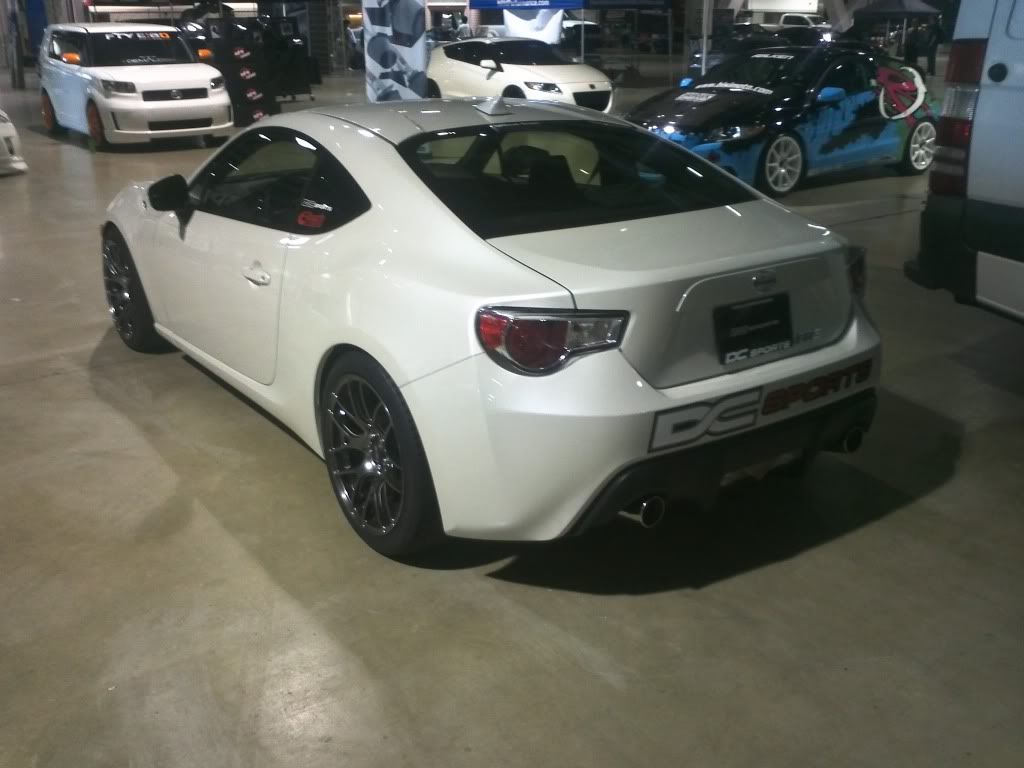 Here my car at Motion Show with DC Sport Prototype Exhaust, and some new wheels. My exhaust sounds great, the added grip from the wider contact patches, and better tires. The bad is the stickers (only for the show) and the heavy wheels. But at least I don't have to worry about my wheels so much. I will running a better quality later, but these will be daily wheels. The stance is XXR 530 18x8.75 with +35 offset all around I think, but I have to double check. I am running Hankook tires with staggered fitment, have the specification later. Also I was going to run my new Perrin FRS/BRZ front liscense plate holder, but I was afraid someone might steal it. I will put it on for the show, right now as you can see it just staging.